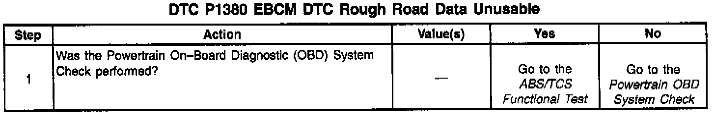 DTC P1380 set indicates that the ABS/TCS system has detected a malfunction which will not allow the EBCM/EBTCM to transmit correct rough road data to the PCM. The Diagnostic System Check in ABS Brakes should be used to diagnose this condition.