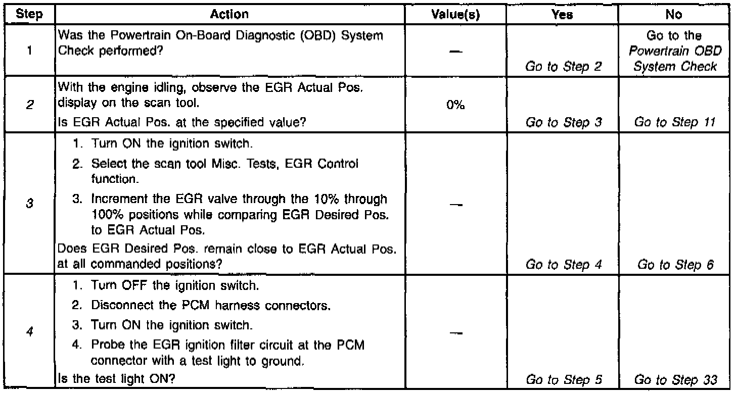 An open in the EGR ignition filter circuit will cause erratic EGR Position Error readings while the EGR valve is operating. With the ignition ON, a test light should illuminate when connected between ground and the EGR ignition filter circuit at the PCM connector. If not, locate and repair the open in the EGR ignition filter circuit.