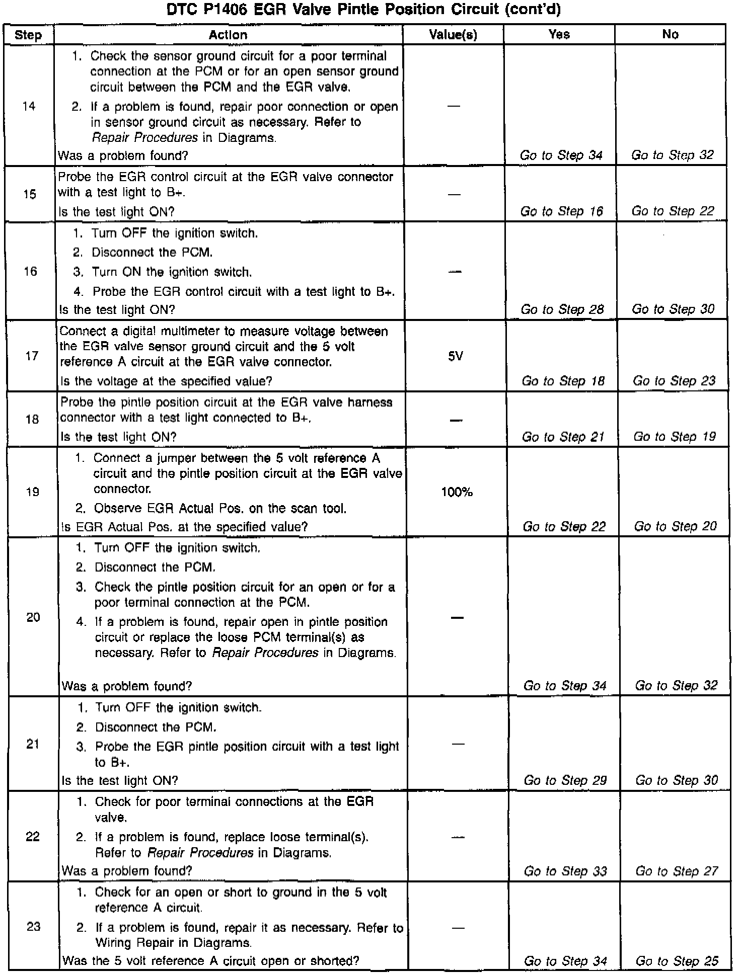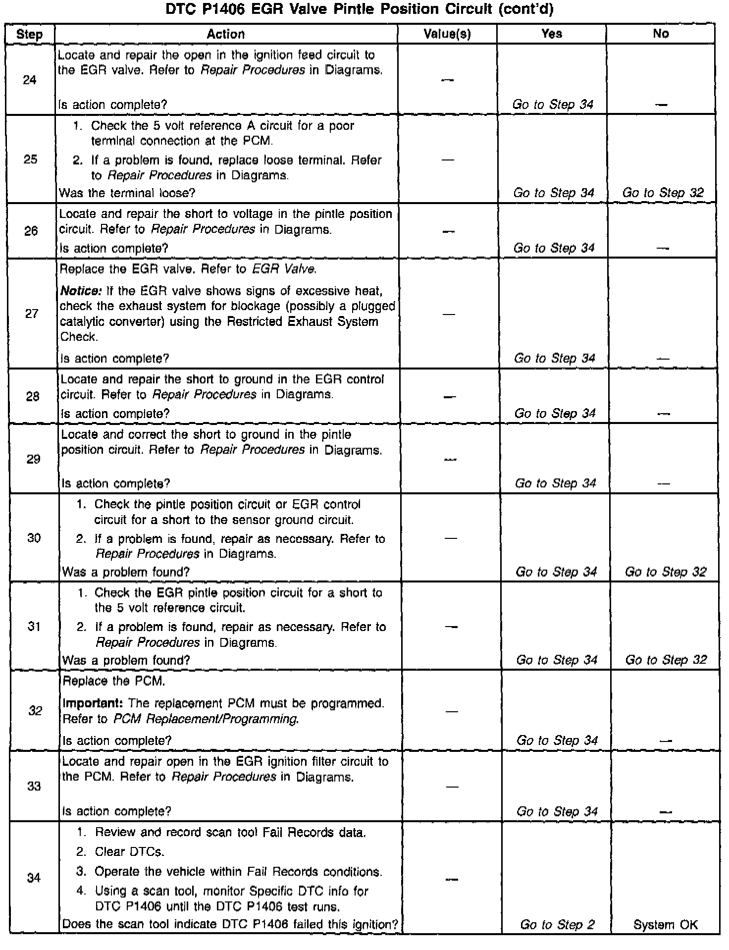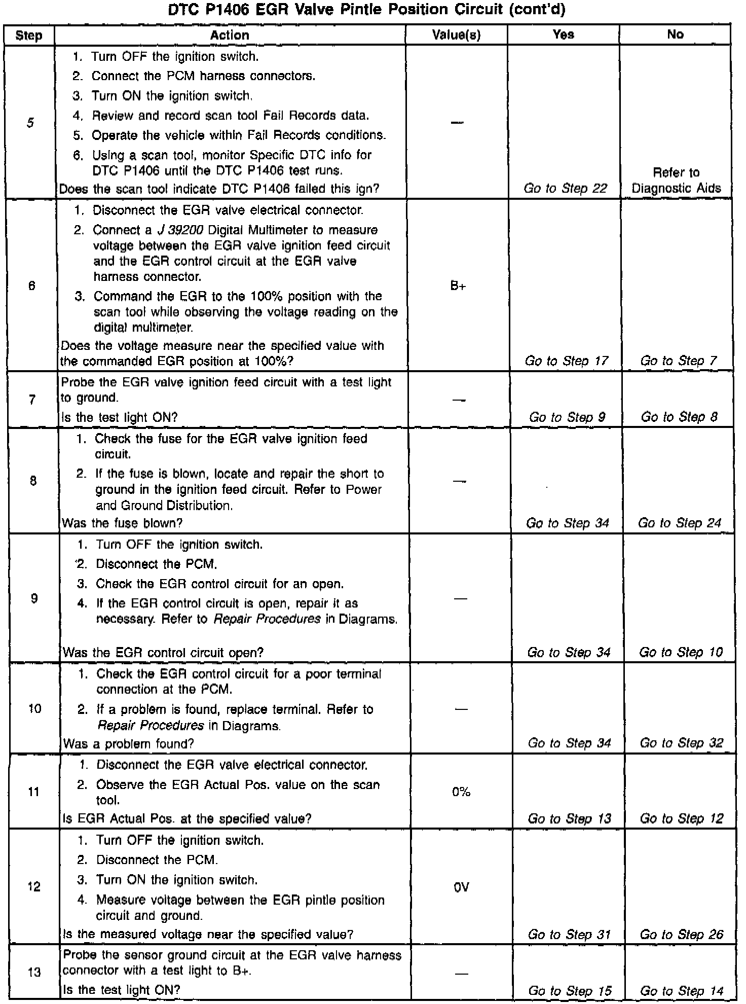 The PCM monitors the EGR valve pintle position input to ensure that the valve responds properly to commands from the PCM and to detect a malfunction if the pintle position sensor and control circuits are open or shorted. If the PCM detects a pintle position signal voltage outside the normal range of the pintle position sensor, or a signal voltage that is not within a tolerance considered acceptable for proper EGR system operation, the PCM will set DTC P1406.
