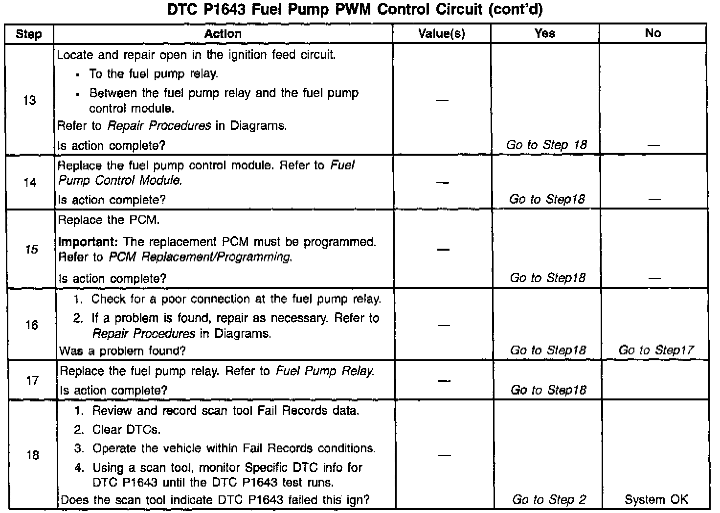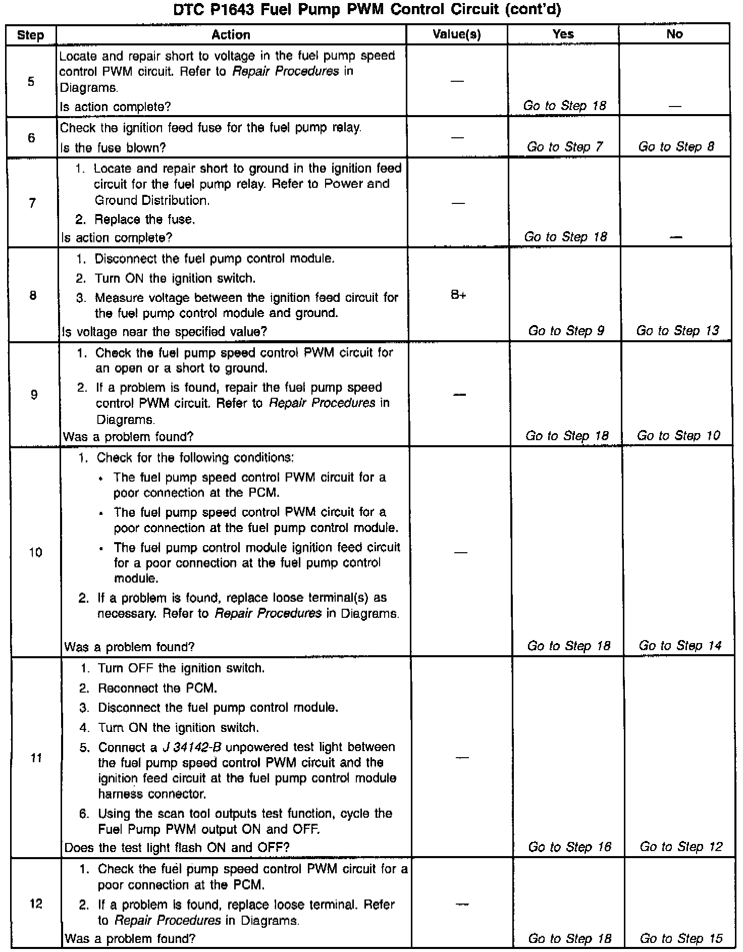 Output Driver Modules (ODMs) are used by the PCM to turn on many of the current-driven devices that are needed to control various engine and Transaxle functions. Each ODM is capable of controlling up to 7 separate outputs by applying ground to the device which the PCM is commanding ON. Unlike the Quad Driver Modules (QDMs) used in prior model years, ODMs have the capability of diagnosing each output circuit individually. DTC P1643 set indicates an improper voltage level has been detected on the fuel pump speed control Pulse Width Modulation (PWM) circuit.