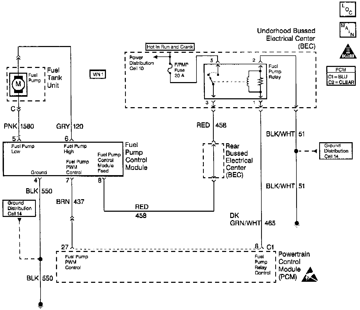 ^ If the harness appears to be OK, disconnect the PCM, turn the ignition ON and observe a digital multimeter connected between the Fuel Pump Speed Control PWM circuit and ground at the PCM harness connector while moving connectors and wiring harnesses related to the Fuel Pump Control Module. A change in voltage will indicate the location of the malfunction.