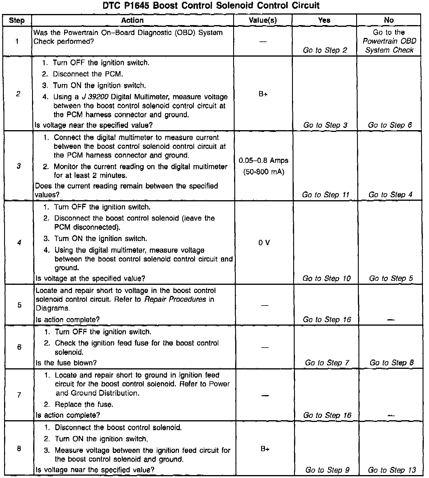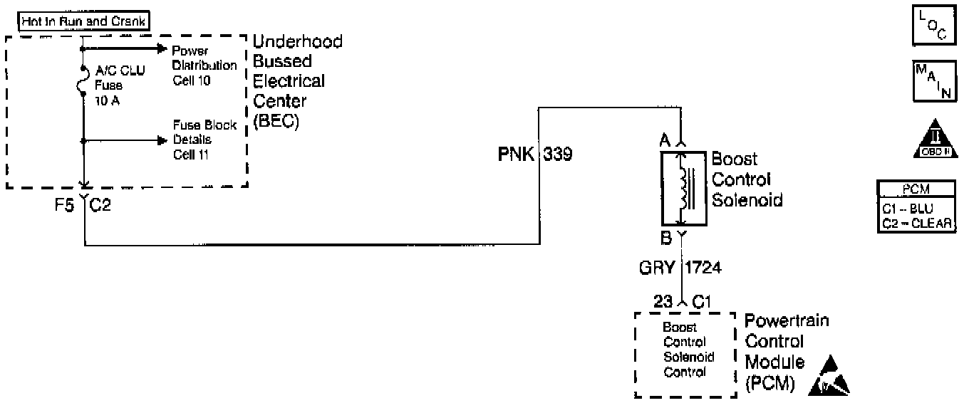 ^ If the harness appears to be OK, disconnect the PCM, turn the ignition ON and observe a voltmeter connected between the Boost Control solenoid control circuit and ground at the PCM harness connector while moving connectors and wiring harnesses related to the Boost Control solenoid. A change in voltage will indicate the location of the malfunction.