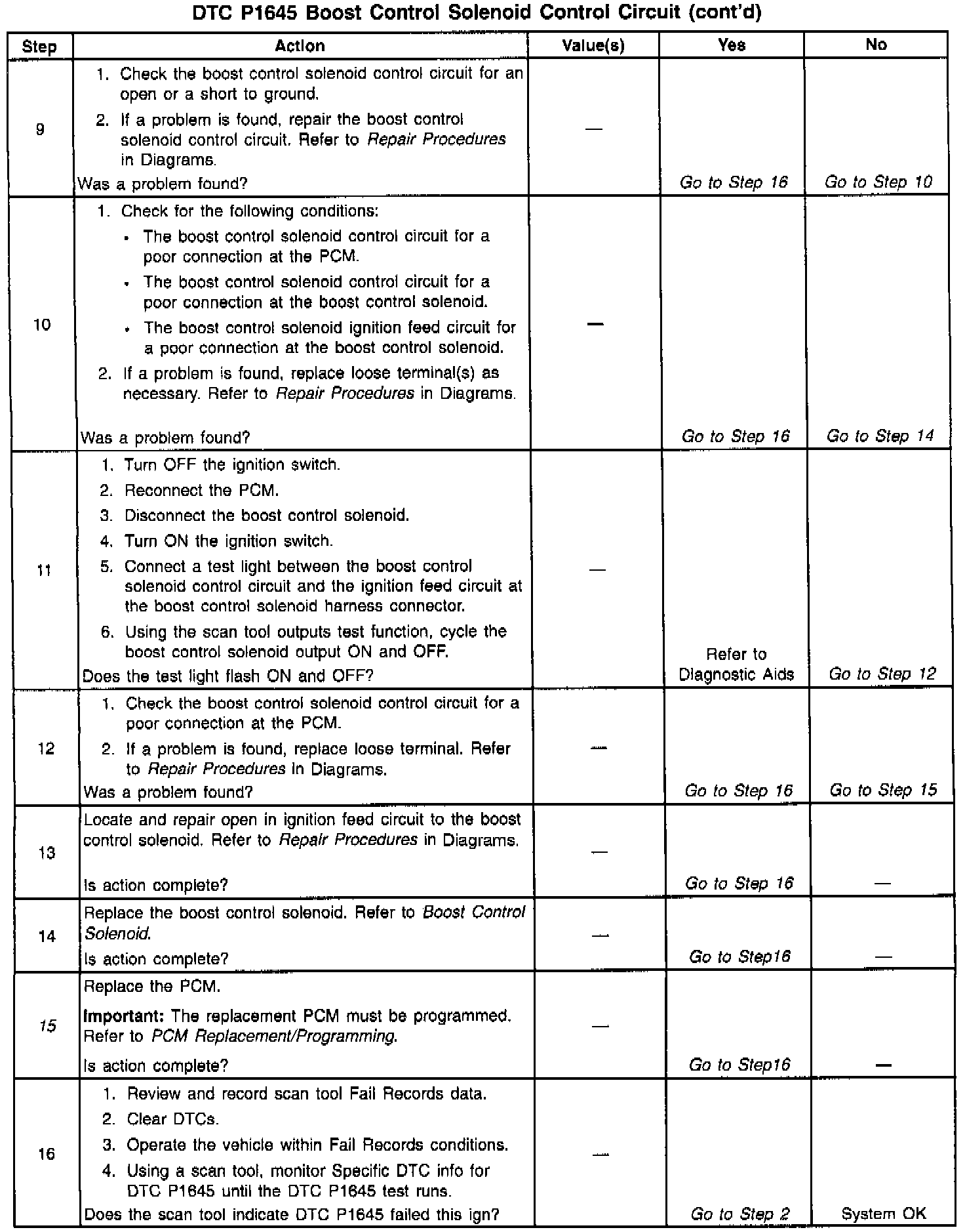 Output Driver Modules (ODMs) are used by the PCM to turn on many of the current-driven devices that are needed to control various engine and Transaxle functions. Each ODM is capable of controlling up to 7 separate outputs by applying ground to the device which the PCM is commanding ON. Unlike the Quad Driver Modules (QDMs) used in prior model years, ODMs have the capability of diagnosing each output circuit individually. DTC P1645 set indicates an improper voltage level has been detected on the supercharger Boost Control Solenoid control circuit.