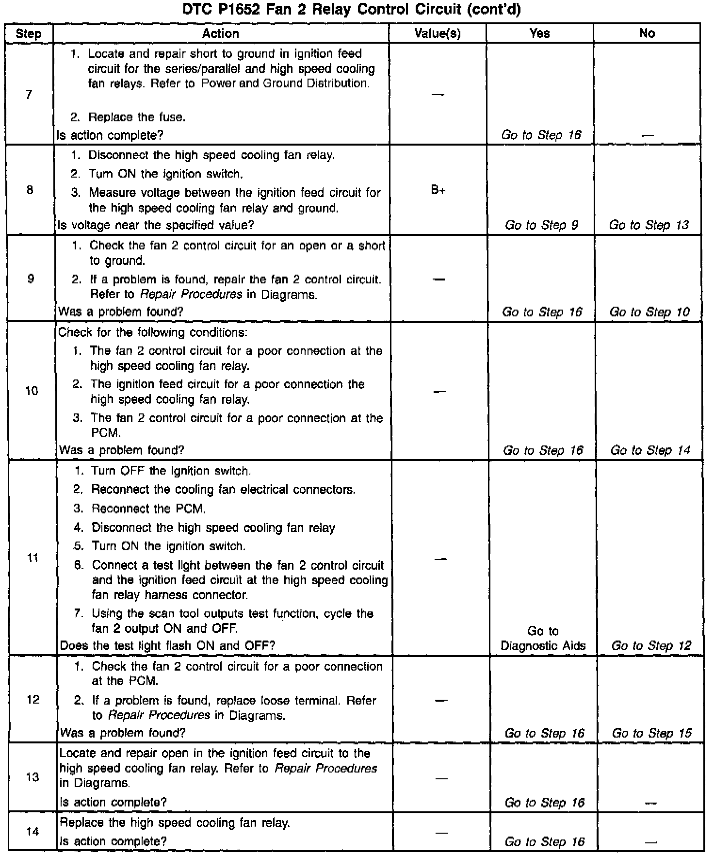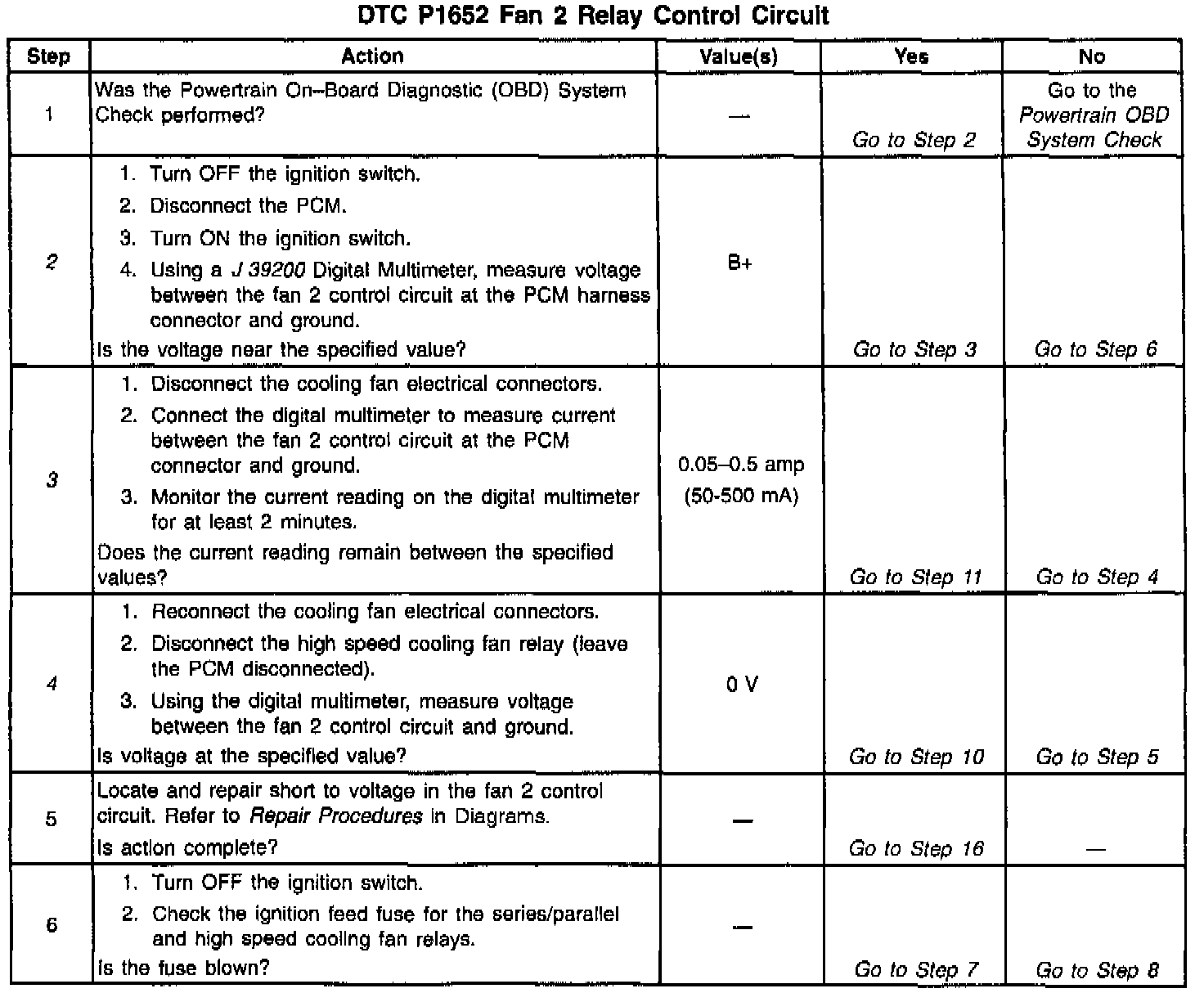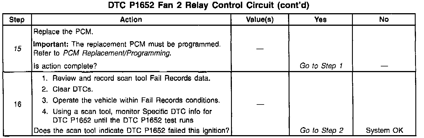 Output Driver Modules (ODMs) are used by the PCM to turn on many of the current-driven devices that are needed to control various engine and Transaxle functions. Each ODM is capable of controlling up to 7 separate outputs by applying ground to the device which the PCM is commanding ON. Unlike the Quad Driver Modules (QDMs) used in prior model years, ODMs have the capability of diagnosing each output circuit individually. DTC P1652 set indicates an improper voltage level has been detected on the high speed cooling fans control circuit.