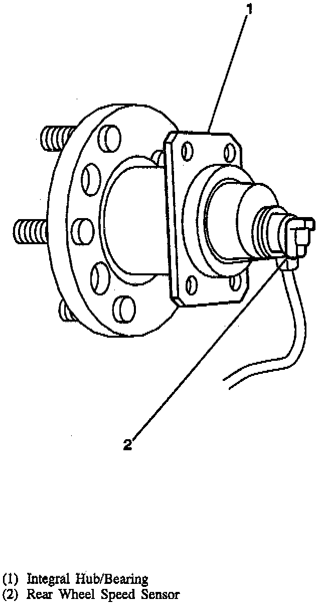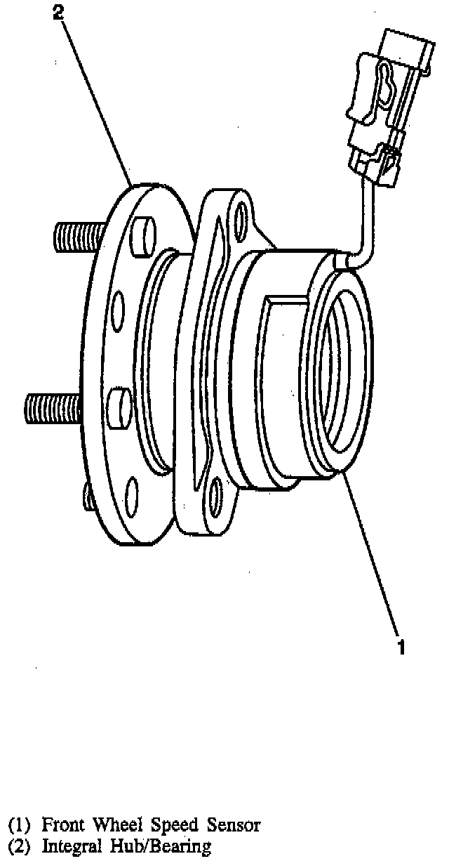 A wheel speed sensor is present at each front wheel bearing assembly and at each rear wheel bearing assembly. The sensors transmit wheel speed information to the Electronic Brake/Traction Control Module (EBCM/EBTCM) by means of an AC voltage signal. This voltage is generated by magnetic induction caused by passing a toothed sensor ring past a stationary sensor. The signal is transmitted to the EBCM/EBTCM through a pair of wires. The front wheel speed sensor is located in the bearing assembly and is non-adjustable. Sensor gap is set at time of assembly. The rear wheel speed sensors are mounted in the rear bearing assembly and are non-adjustable. Sensor gap is set at the time of assembly.