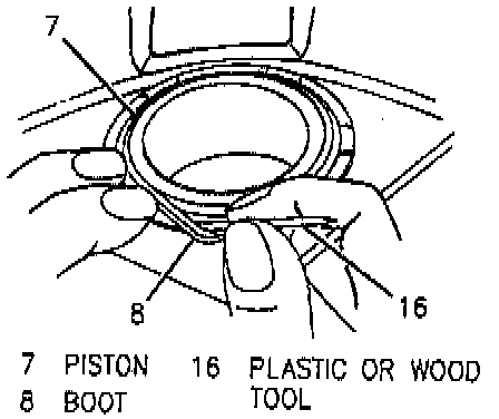 2. After bottoming piston, use a small plastic or wood tool to lift inner edge of boot next to piston, and press out any trapped air. Boot must lay flat. Make sure convolutions are tucked back into place.