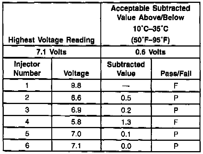 3. The first second of the voltage displayed by the DVM may be inaccurate due to the initial current surge, therefore, record the lowest voltage displayed by the DVM after the first second of the test. The voltage displayed by the DVM may increase throughout the test as the fuel injector windings warm and the resistance of the fuel injector windings changes. An erratic voltage reading (large fluctuations in voltage that do not stabilize) indicates an intermittent connection within the fuel injector. From the voltages recorded, identify the highest voltage, excluding any voltages above 9.5 volts. Subtract each voltage that is not above 9.5 volts from the highest voltage. Record each subtracted value (refer to the Example). The subtracted value for any fuel injector must not exceed 0.6 volt. A fuel injector with a subtracted value that is greater than 0.7 volt is considered faulty and must be replaced. A fuel injector with a recorded voltage above 9.5 volts is also considered faulty and must be replaced.