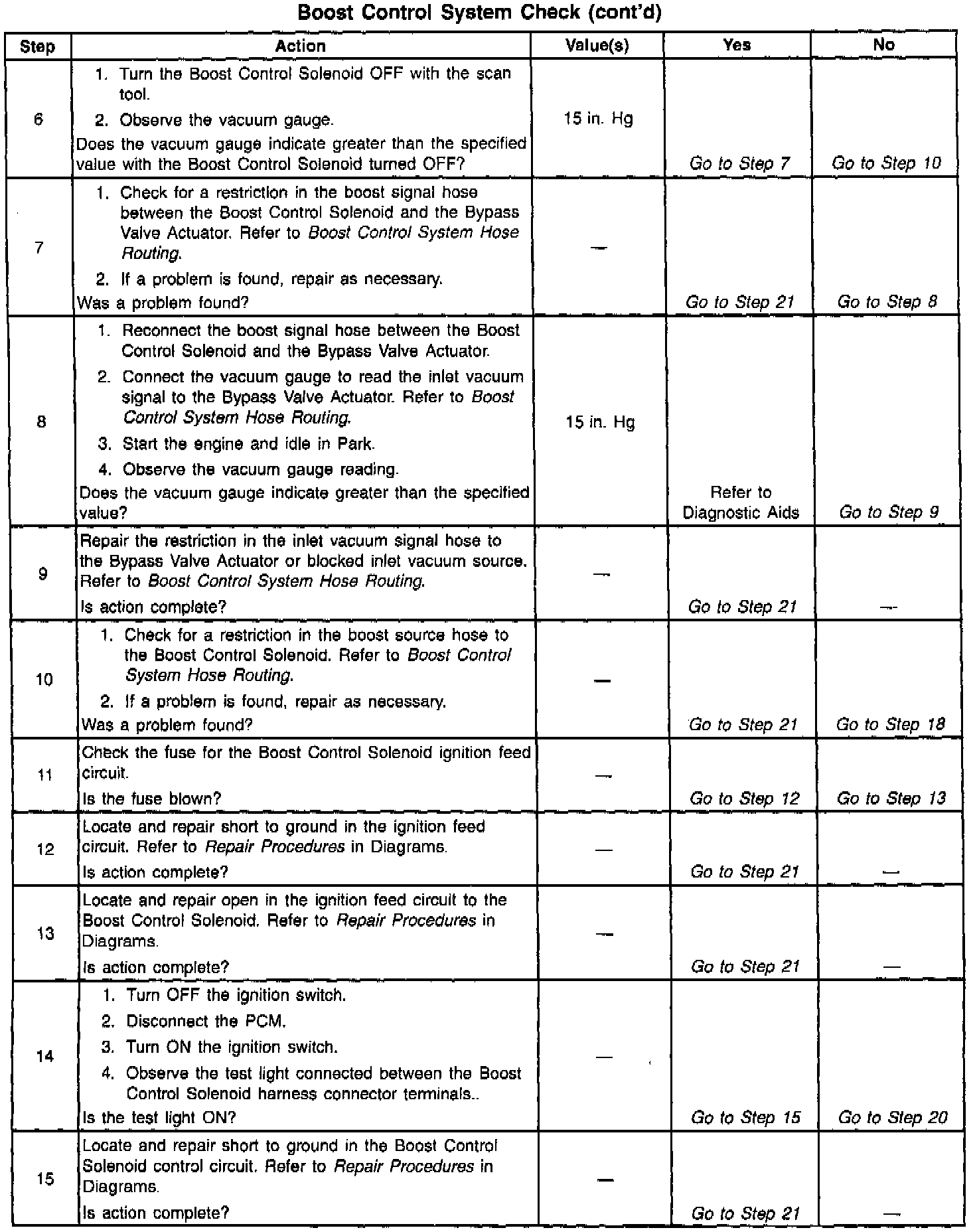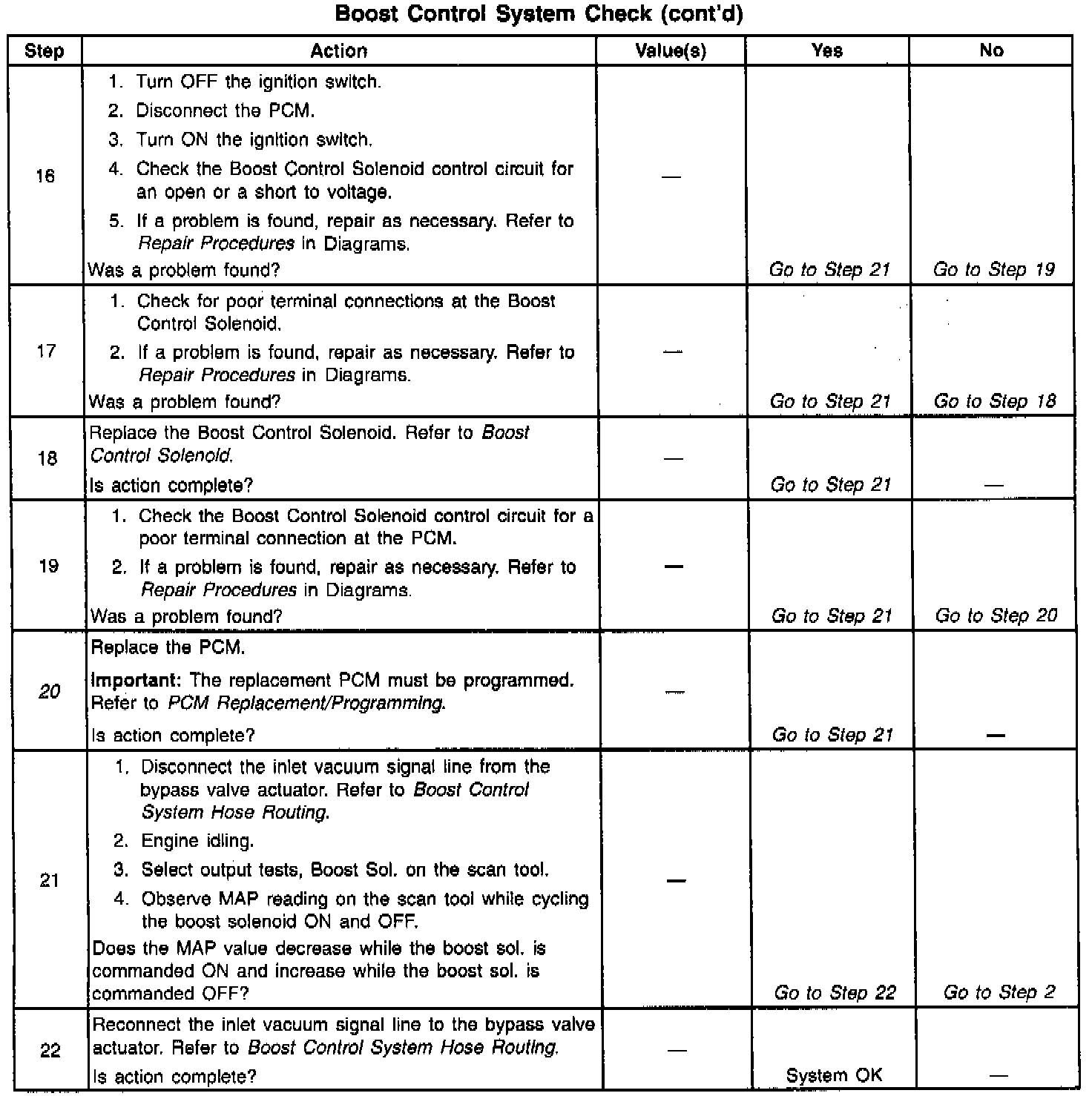 If the Boost Control System Check has been performed and no electrical or vacuum related fault is noted, check for the following conditions: