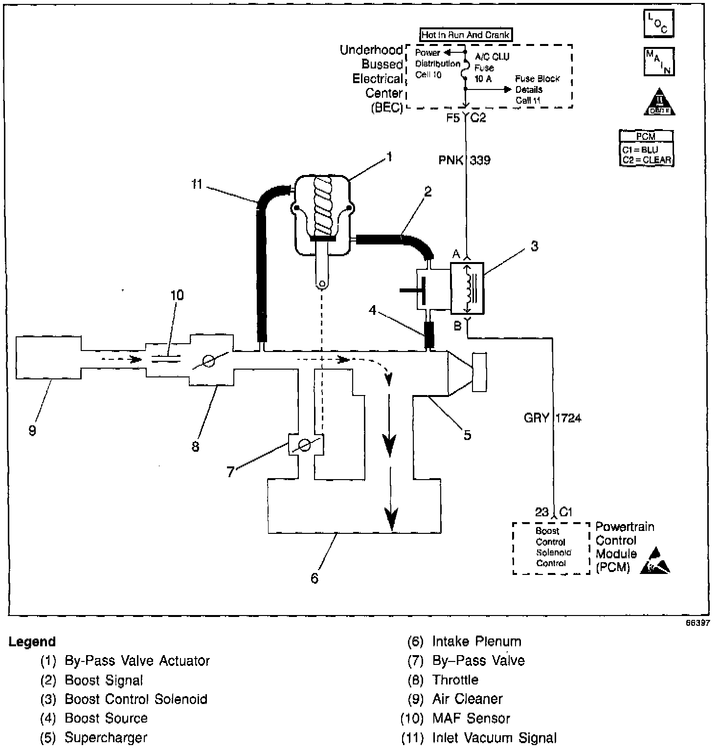Under most conditions, the PCM commands the boost control solenoid to operate at a 100% duty cycle (ON) to allow full boost pressure upon demand. However, if reverse gear is selected or the PCM detects rapid deceleration or engine load is extremely high, reduced boost pressure is desired. Under these conditions, the PCM commands the boost control solenoid to operate at a 0% duty cycle (OFF), which opens the bypass valve. With the Bypass valve open, boost pressure is reduced by recirculating intake air back through the supercharger inlet.