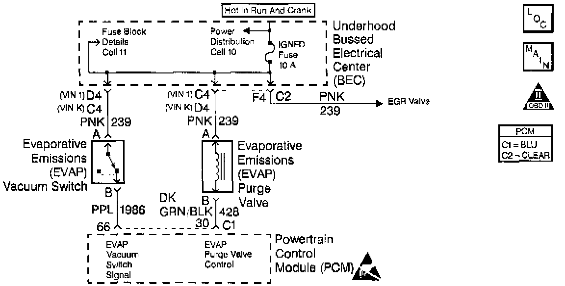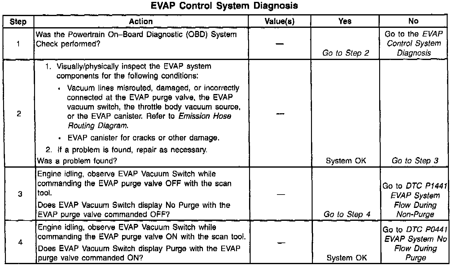 The EVAP purge vacuum switch is a normally closed switch positioned in the purge line between the canister and the EVAP purge valve. The EVAP purge vacuum switch will open when vacuum increases to greater than 5 inches of water in the purge line. The PCM monitors the EVAP purge vacuum switch signal to determine of the evaporative emission control system is working properly. If the switch is closed (no purge flow) when the PCM is commanding the EVAP purge valve ON, DTC P0441 should be set. If the switch is open (purge flow detected) when the PCM is not commanding the EVAP purge valve ON, DTC P1441 should be set.
