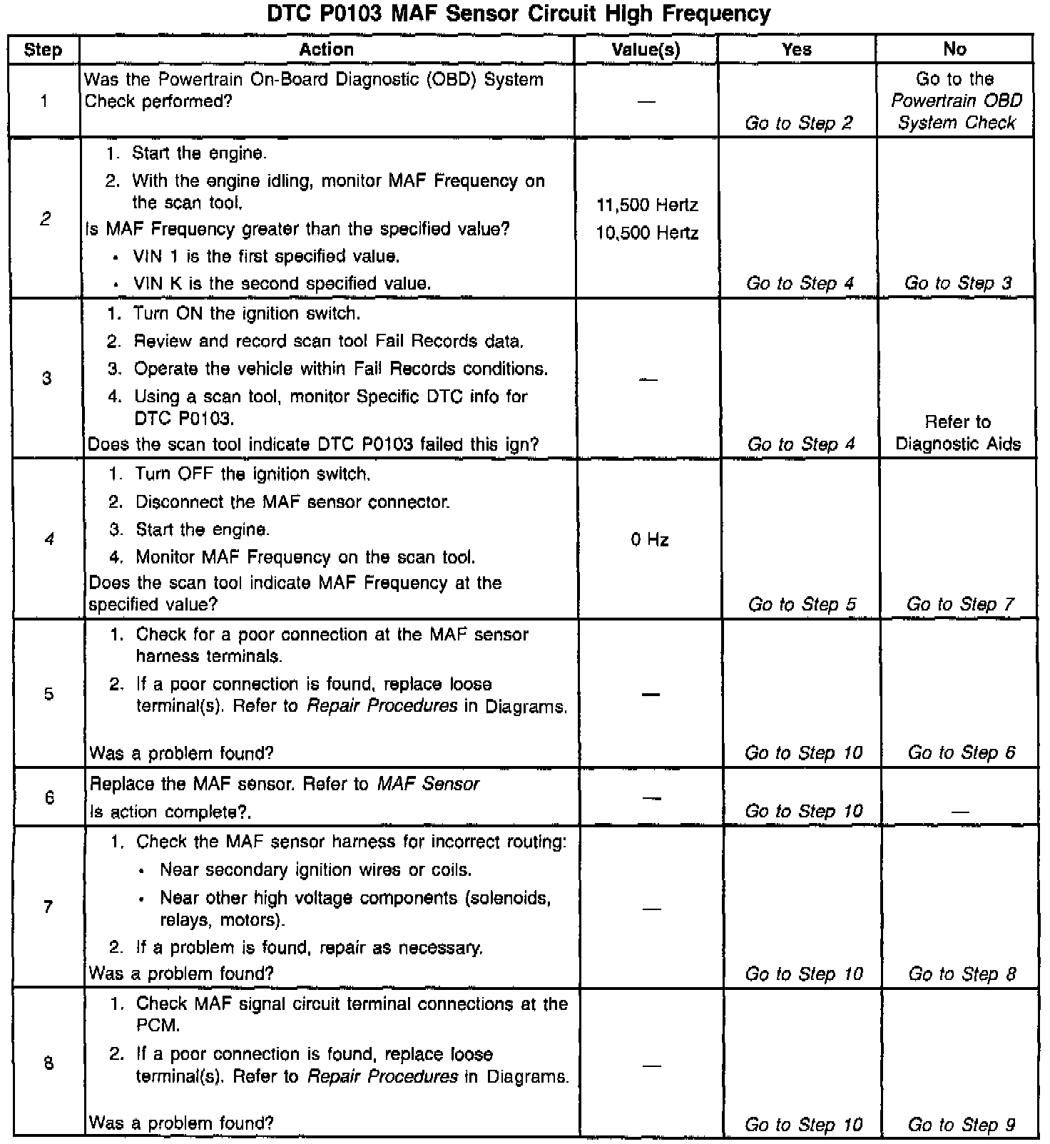 The Mass Air Flow (MAF) sensor measures the amount of air which passes through it into the engine during a given time. The PCM uses the mass air flow information to monitor engine operating conditions for fuel delivery calculations. A large quantity of air entering the engine indicates an acceleration or high load situation, while a small quantity of air indicates deceleration or idle. The MAF sensor produces a frequency signal which can be monitored using a scan tool. The frequency will vary within a range of around 2000 Hertz at idle to about 10,000 Hertz at maximum engine load. DTC P0103 will be set if the signal frequency from the MAF sensor is higher than the possible range of a normally operating MAF sensor.