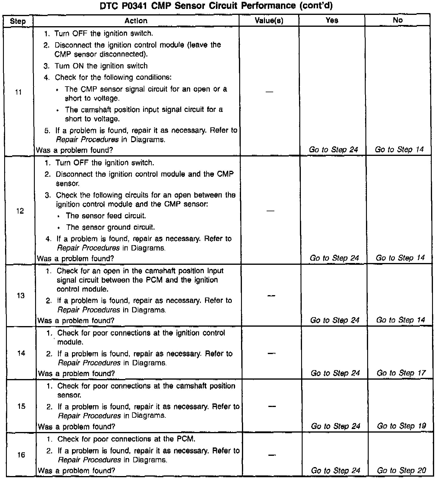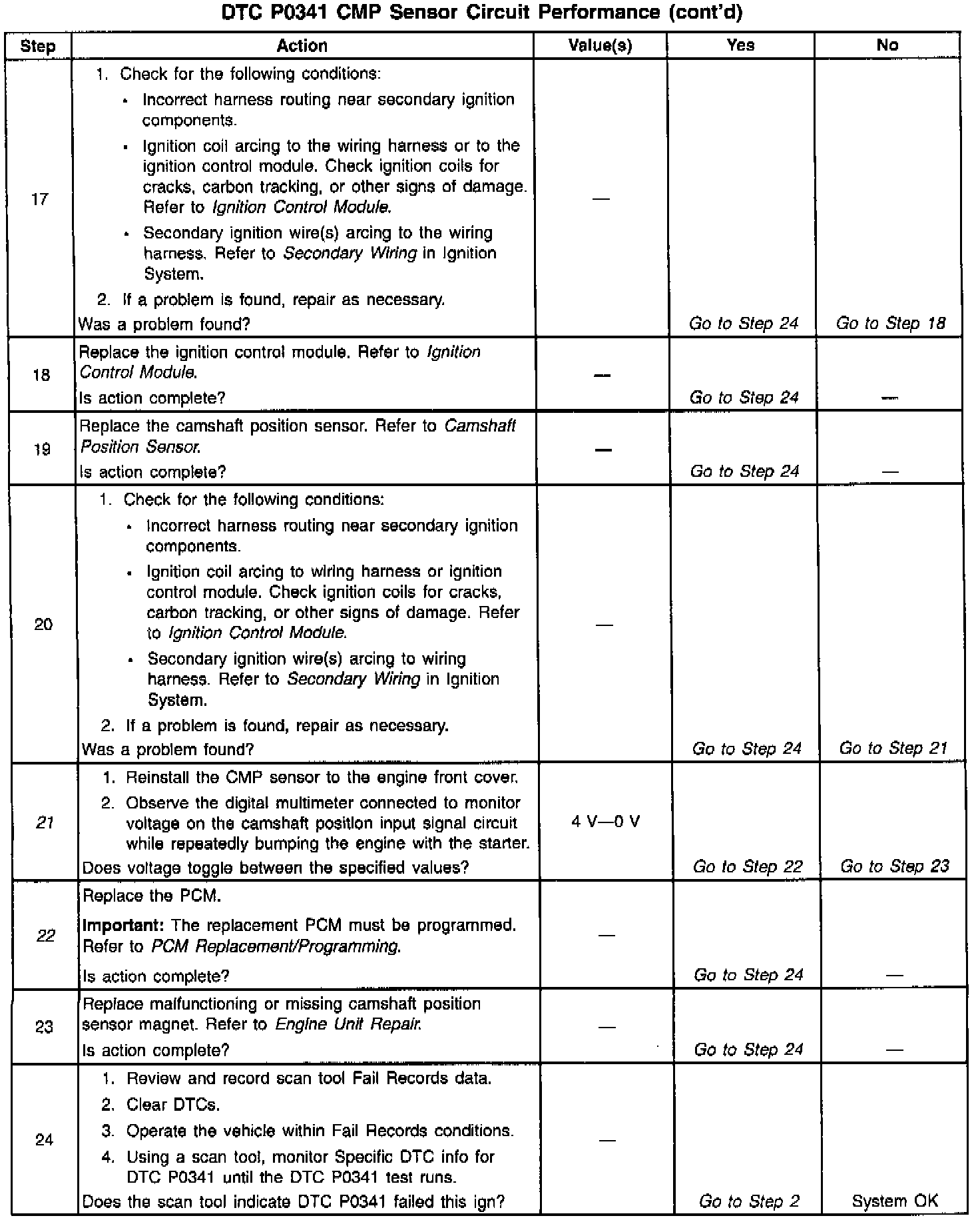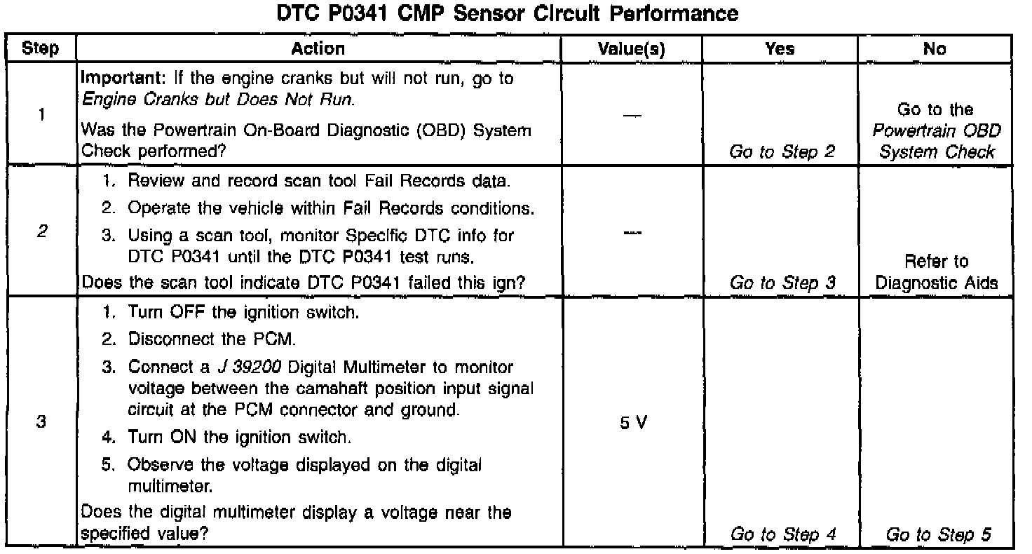 The camshaft position PCM input is produced by the ignition control module. The Ignition Control Module (ICM) produces the camshaft position PCM input by filtering the Camshaft Position (CMP) sensor pulses when the engine is running and Crankshaft Position (CKP) sync pulses are also being received. The PCM uses the camshaft position PCM input pulses to initiate sequential fuel injection and to determine crankshaft position for the misfire diagnostic. The PCM constantly monitors the number of pulses on the camshaft position PCM input circuit and compares the number of camshaft position PCM input pulses to the number of 18X reference pulses and the number of 3X reference pulses being received. If the PCM receives an incorrect number of pulses on the camshaft position PCM input circuit, DTC P0341 will set and the PCM will initiate injector sequence without the camshaft position PCM input with a one in six chance that injector sequence is correct. The engine will continue to start and run normally, although the misfire diagnostic will be disabled.