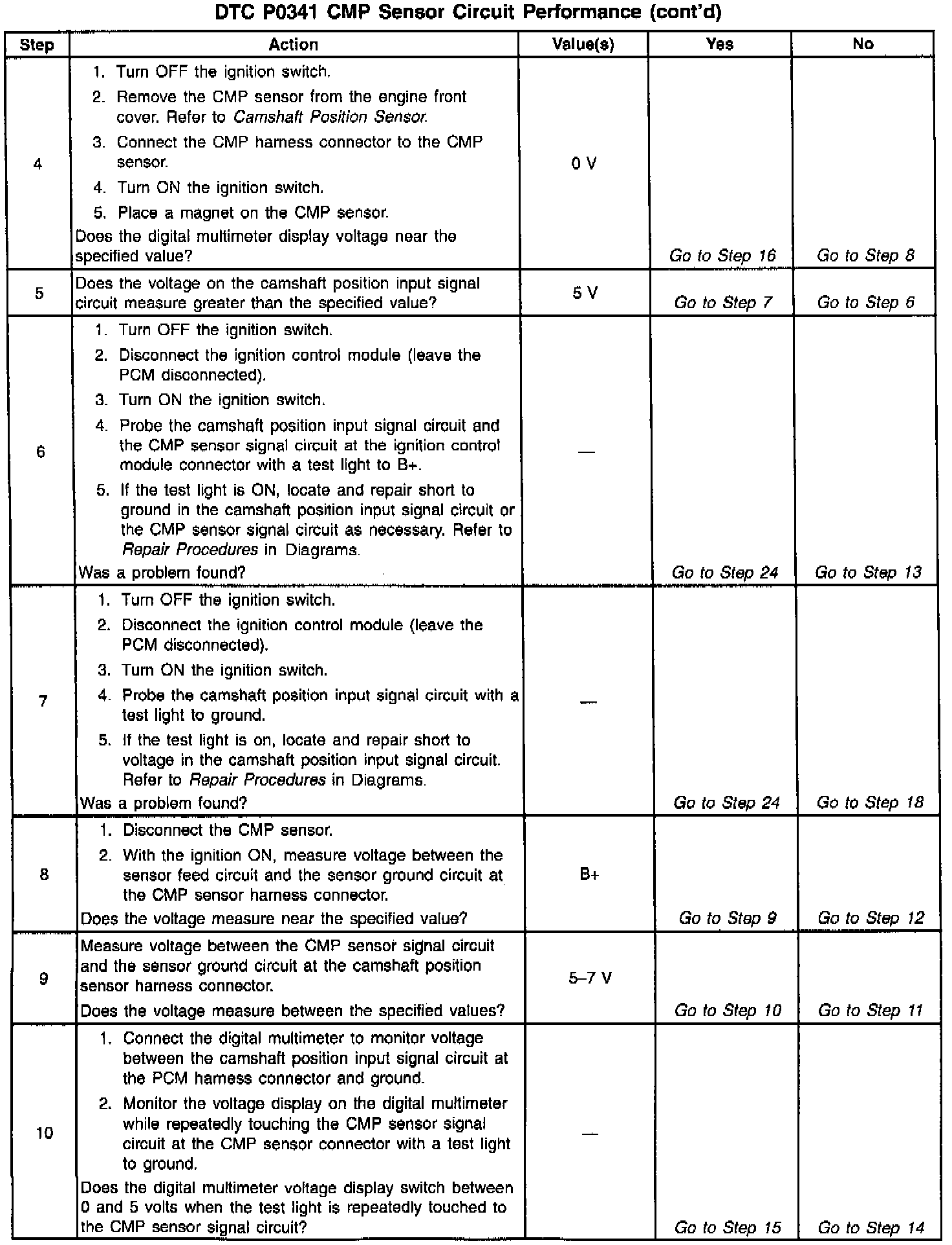 ^ If the harness appears to be OK, disconnect the PCM, turn the ignition on and observe a voltmeter connected to the camshaft position input signal circuit at the PCM harness connector while moving connectors and wiring harnesses related to the ICM and the CMP sensor. A change in voltage will indicate the location of the malfunction.