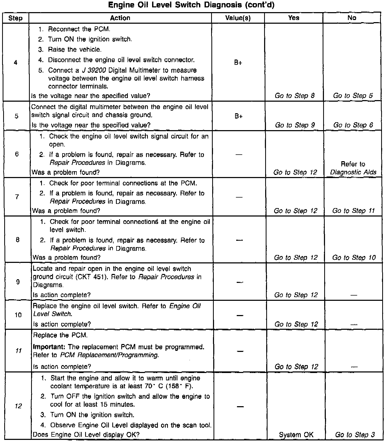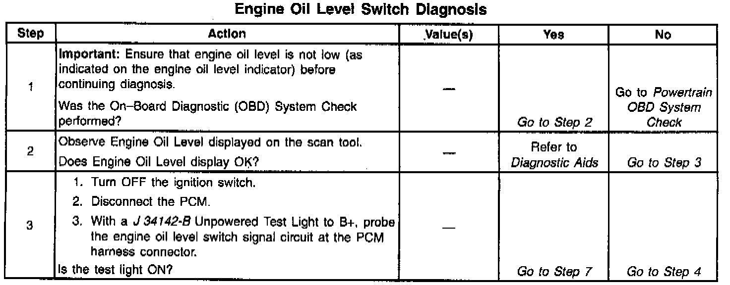 If a problem with a check engine oil message can not be isolated using the Engine Oil Level Switch diagnostic table, refer to the Instrument Cluster System Check in Electrical Diagnosis.