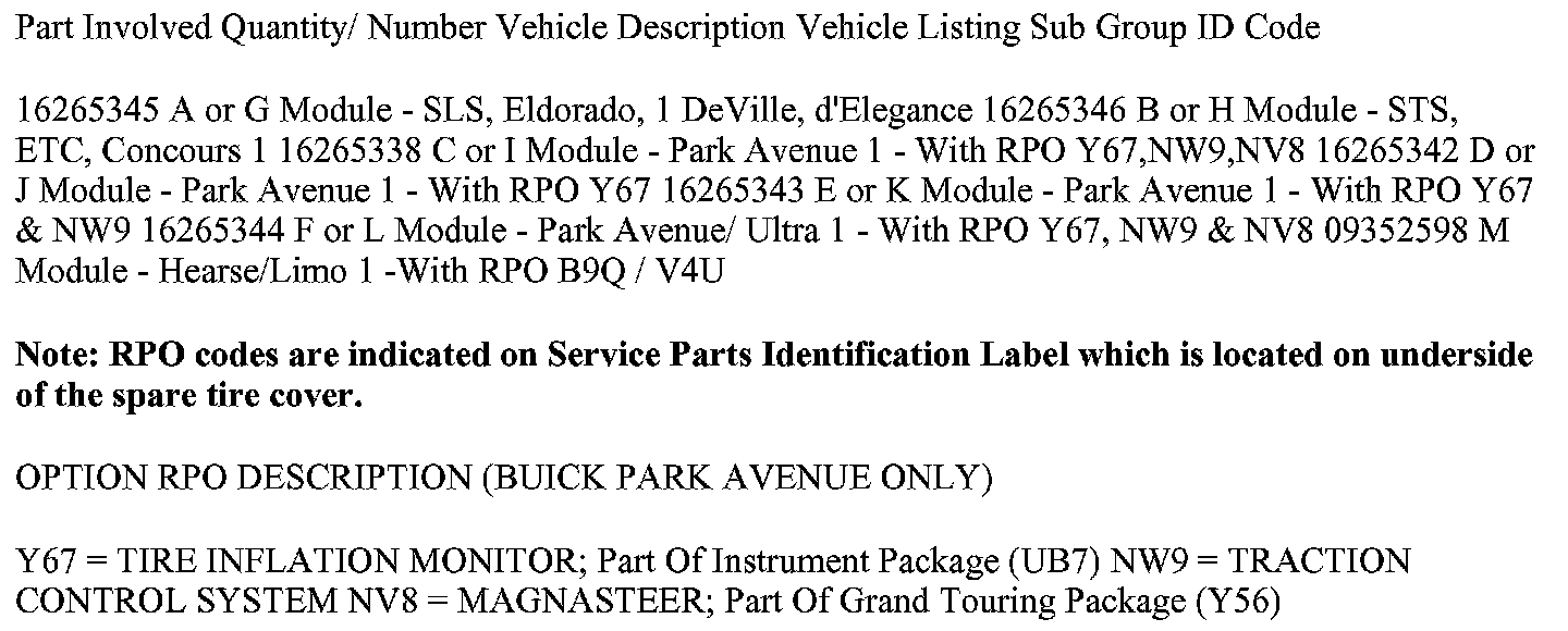 Involved are certain 1997 Buick Park Avenue/Ultra; Cadillac DeVille, DeVille d' Elegance, DeVille Concours, Eldorado, Eldorado Touring Coupe (ETC), Seville Luxury Sedan (SLS), Seville Touring Sedan (STS) model vehicles built within the following VIN breakpoints: