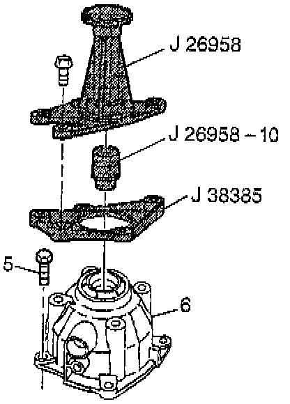 7. Install J 26958, J 26958-10, and J 38385 onto the case extension (6), if you have not yet installed these tools.