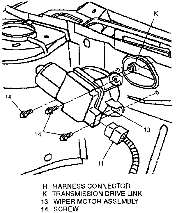 4. Electrical connector (H) from wiper motor assembly (13).