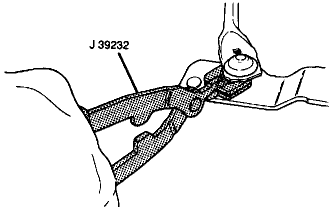 3. Transmission drive link (K) socket to wiper motor assembly (13) crank arm ball using J 39529. Be sure socket is fully seated on ball.