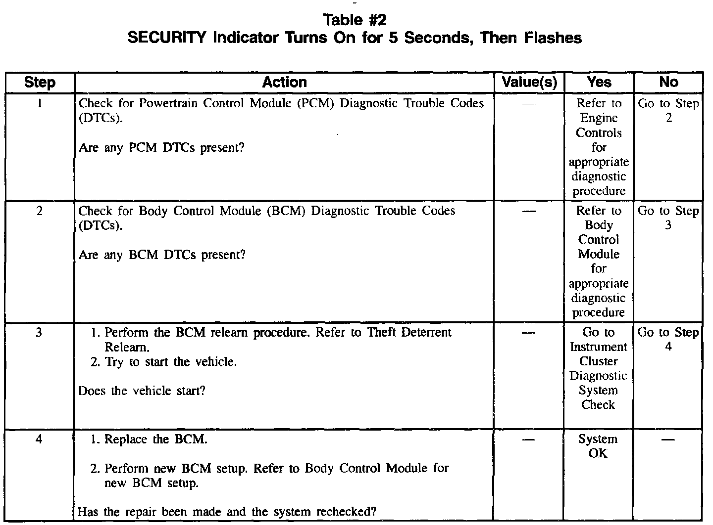 Table 2 SECURITY IND Turns ON For 5 Seconds, Then Flashes
