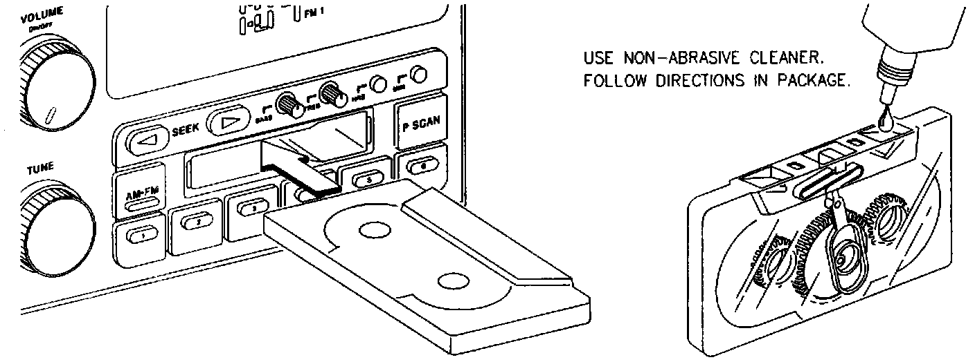 Proper tape player cleaning should be done with a scrubbing action, non-abrasive cleaning cassette (part of J 39916). This is a wet-type cleaning system that uses a cleaning cassette with pads which scrub the tape head as the hubs of the cleaner cassette turn. If this type of cleaner is used, the radio may display an error and eject the cartridge. This is normal and is the result of an added feature in the tape player that detects broken tapes. If an error occurs, insert the cleaning cassette at least three times to thoroughly clean the tape player. A non-scrubbing action, wet-type cleaner can also be used. This type of cleaner uses a cassette with a fabric belt which cleans the tape head. This type of cleaning cassette will not cause an error, but it may not clean the tape player as thoroughly as the scrubbing type cleaner.