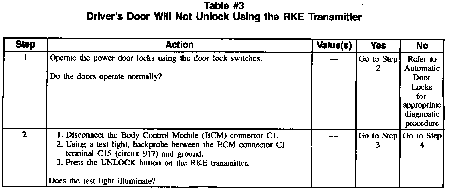 Table #3 Driver's Door Will Not Unlock Using The RKE Transmitter (Part 1 Of 2):