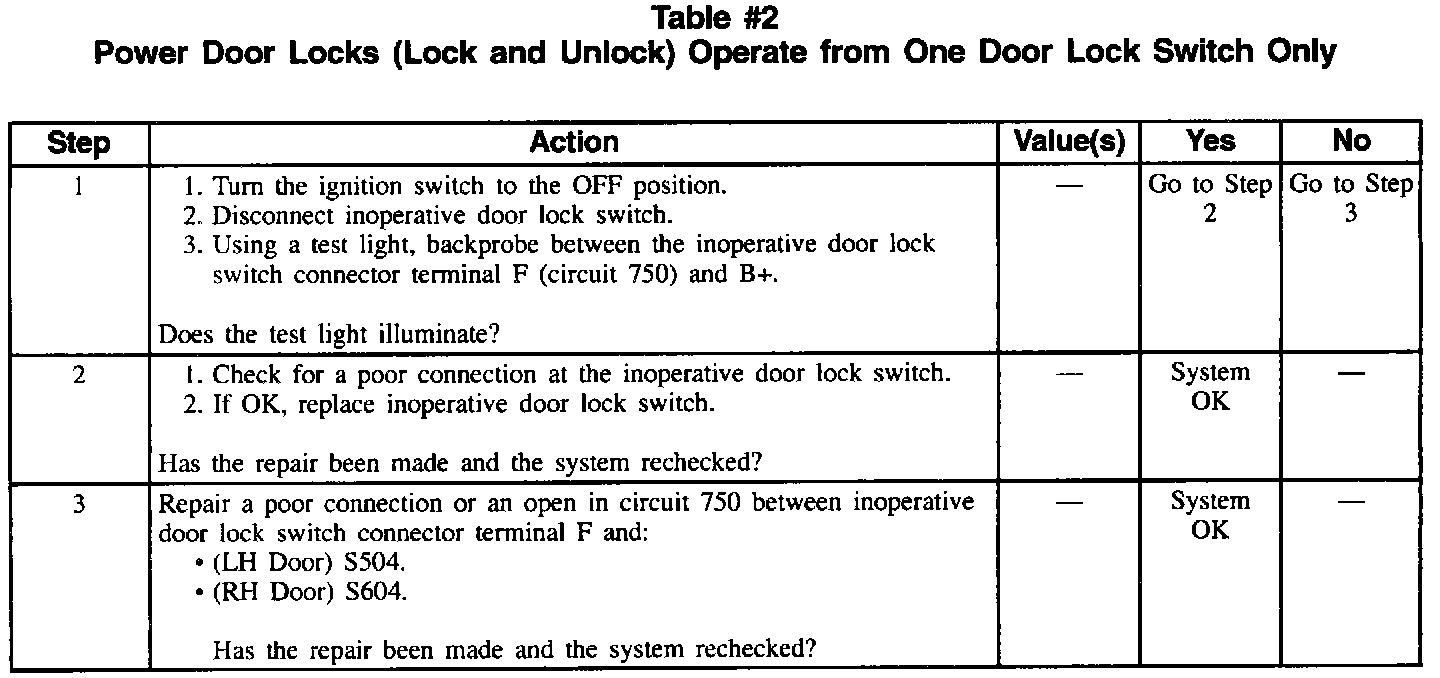 Table #2 Power Door Locks Operate From One Door Lock Switch Only: