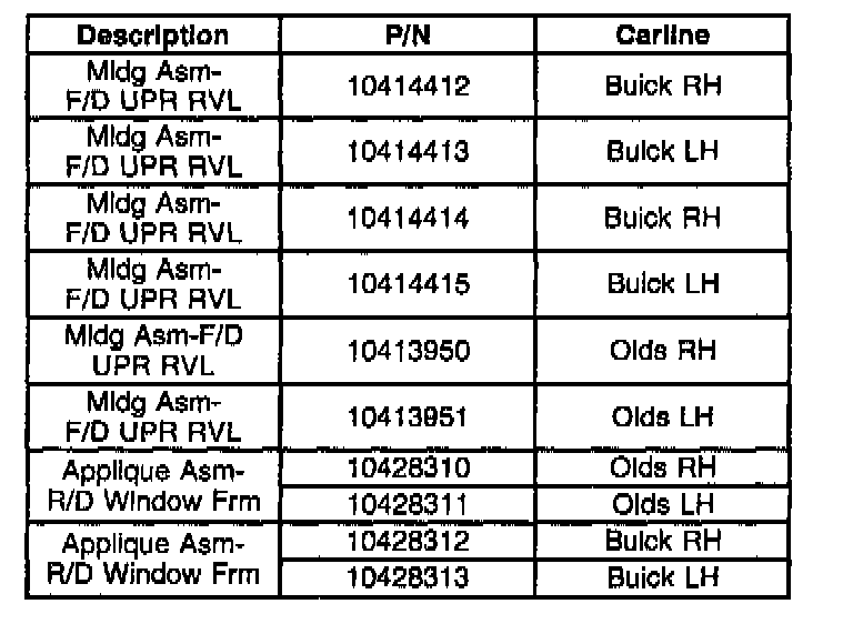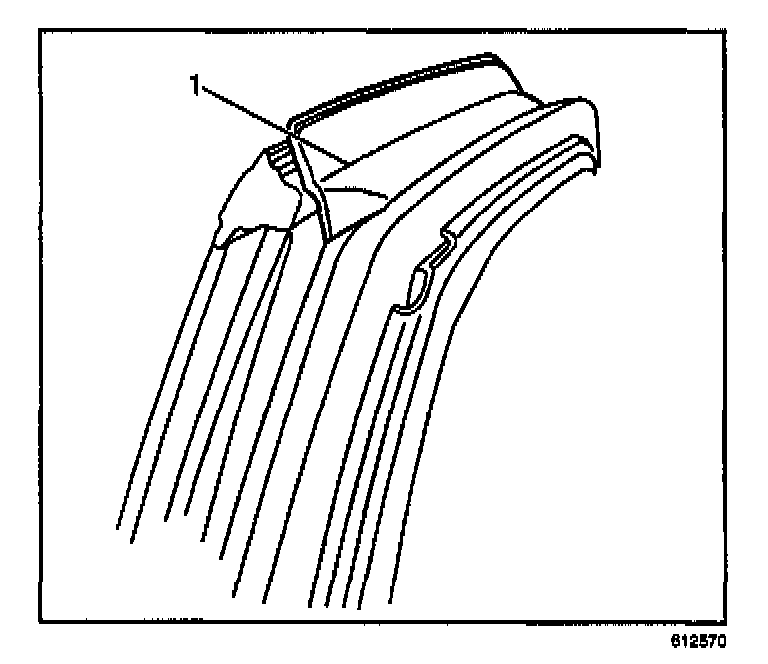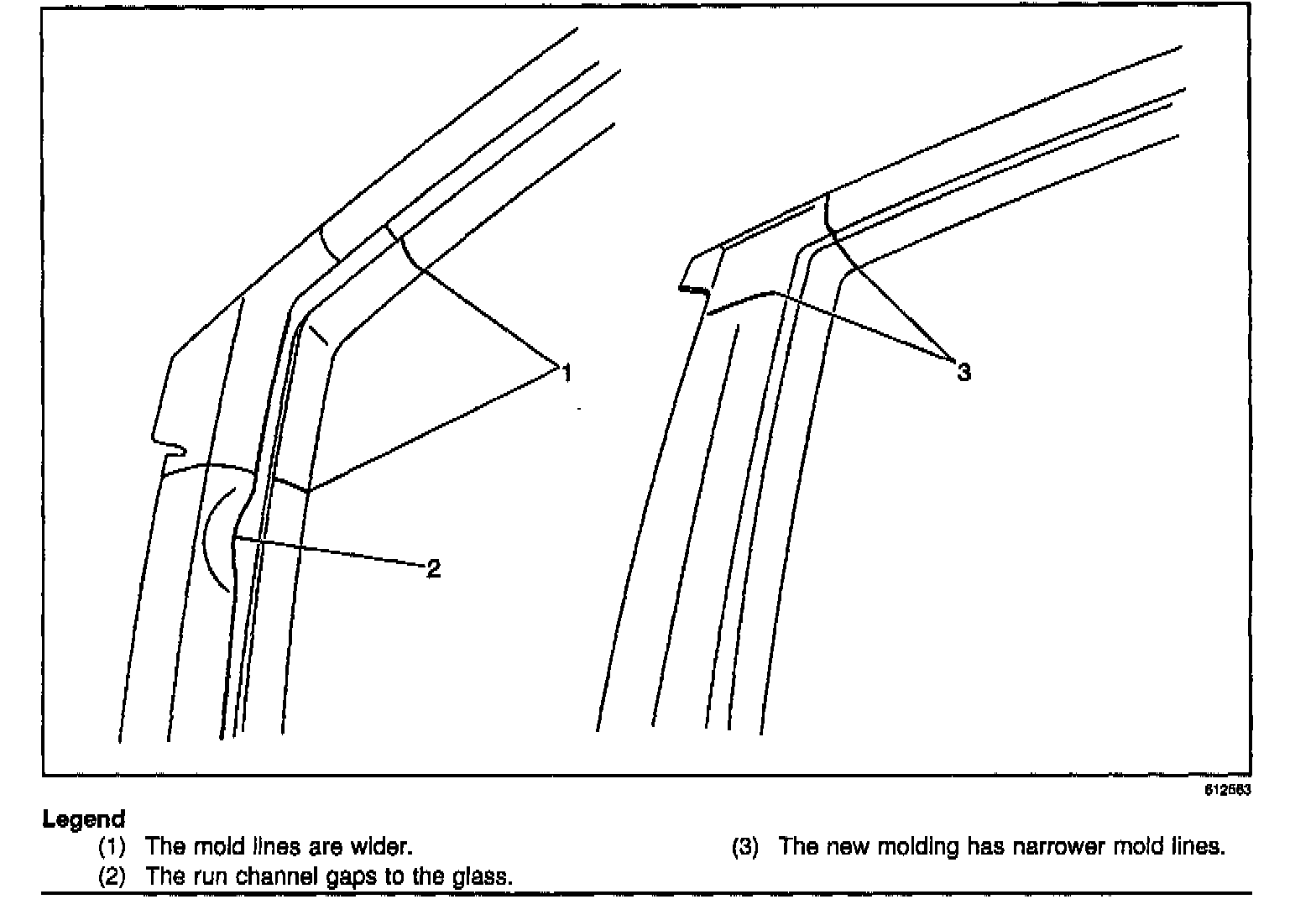 Replace the upper reveal molding. The new molding has more material for added stiffness. To aid in identifying an old molding, it has a parting line (1) down the center of the molding.