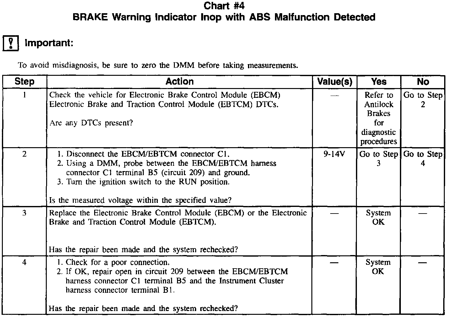 Chart #4 BRAKE Warning Indicator INOP With ABS Malfunction Detected: