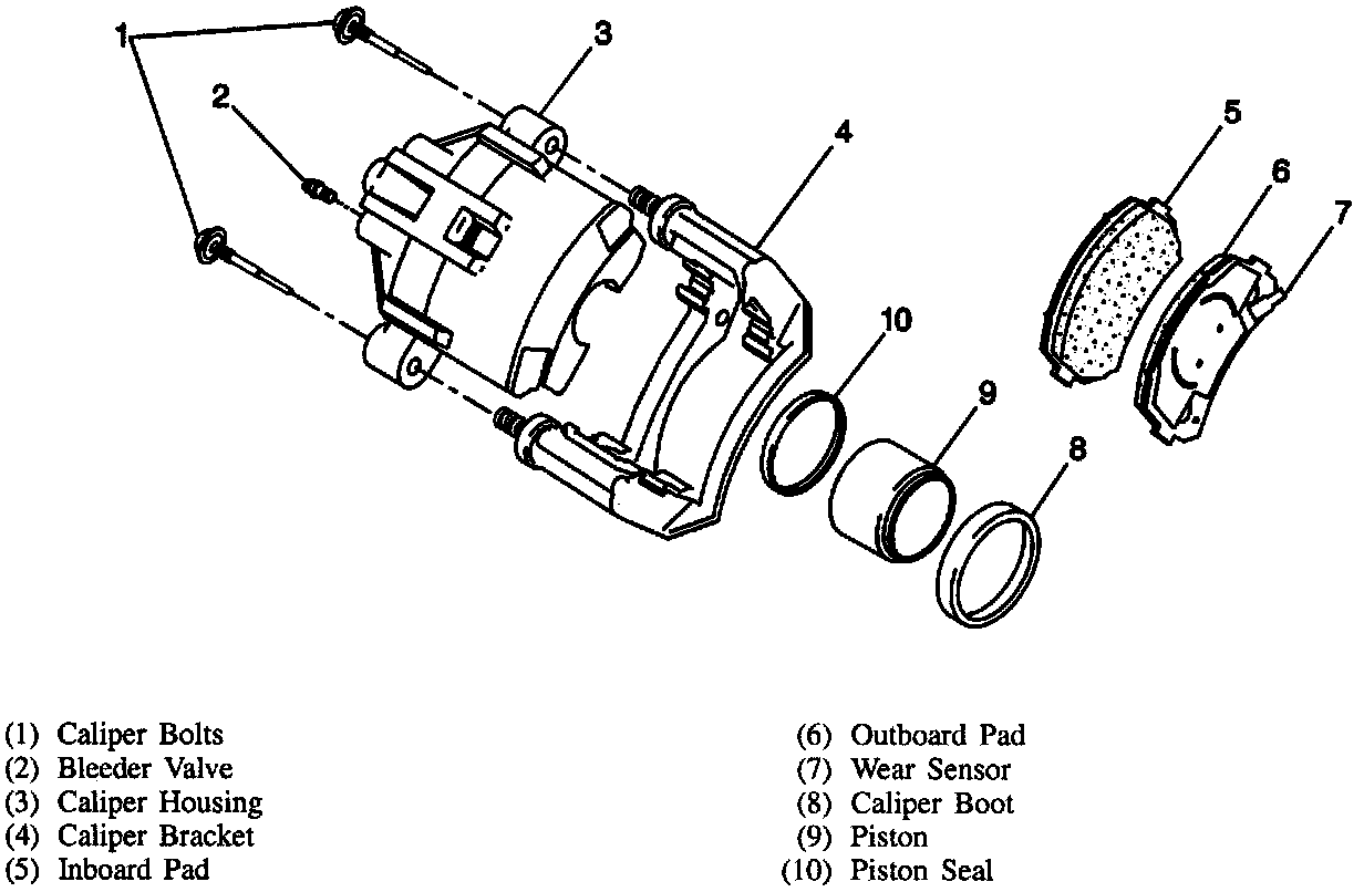 The caliper used on this vehicle has a single bore and is mounted to the support bracket with two mounting bolts. Hydraulic pressure created by applying the brake pedal, is converted by the caliper to a stopping force. This force acts equally against the piston and the bottom of the caliper bore to move the piston outward and to move (slide) the caliper inward resulting in a clamping action on the rotor. This clamping action forces the pads against the rotor, creating friction to stop the vehicle.