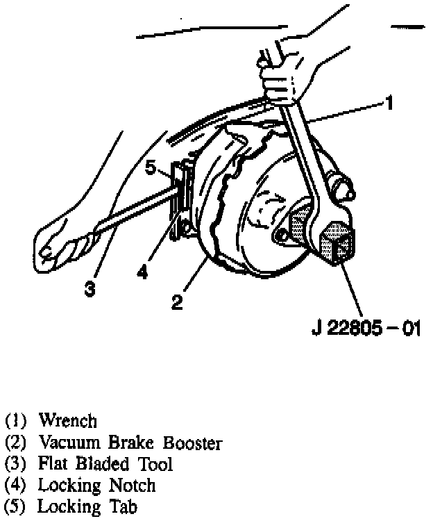 9. Use a flat-bladed tool to pry locking tab on booster out of locking notch on mounting flange. At the same time turn the booster counterclockwise with a wrench on J 22805-01.