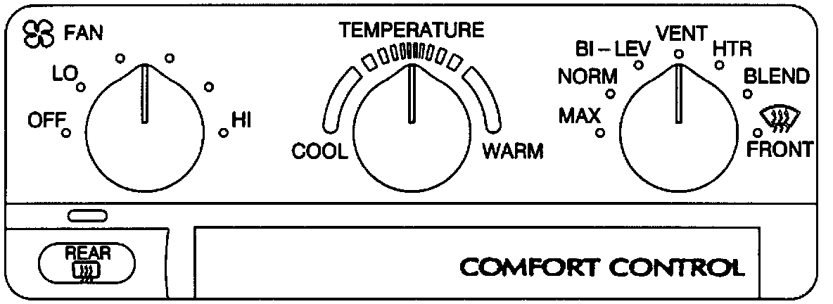 The temperature knob controls the temperature valve through a potentiometer in the controls and electric motor attached to the heater module. The knob on the left controls blower motor speed. Turning the knob to the right increases motor speed. The blower is turned off in the "OFF" mode of operation.