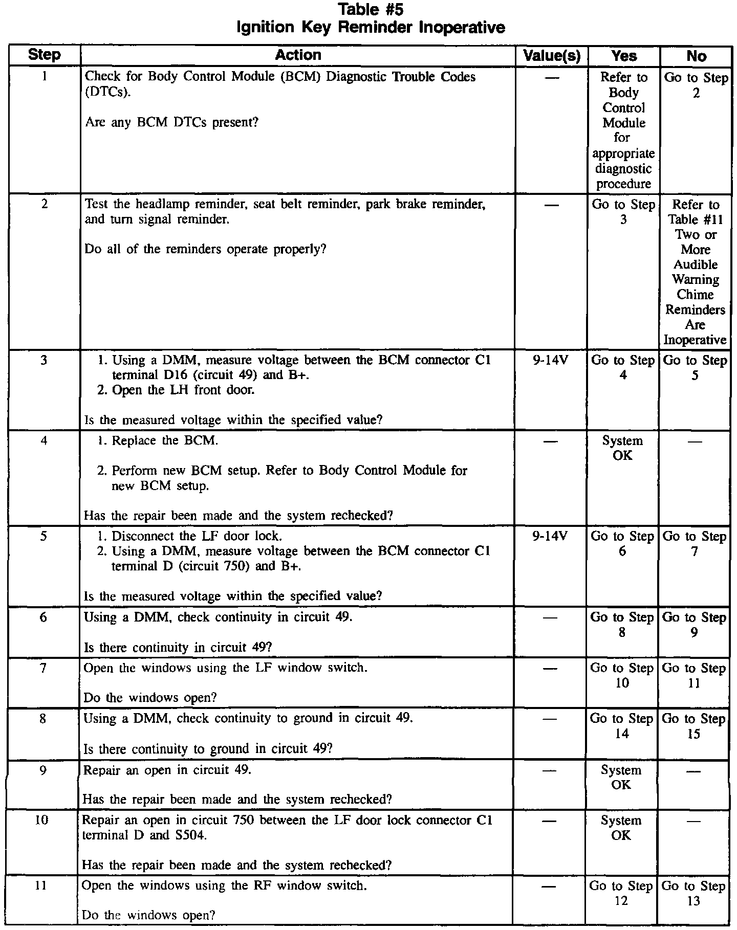 Table 5 Ignition Key Reminder Inoperative