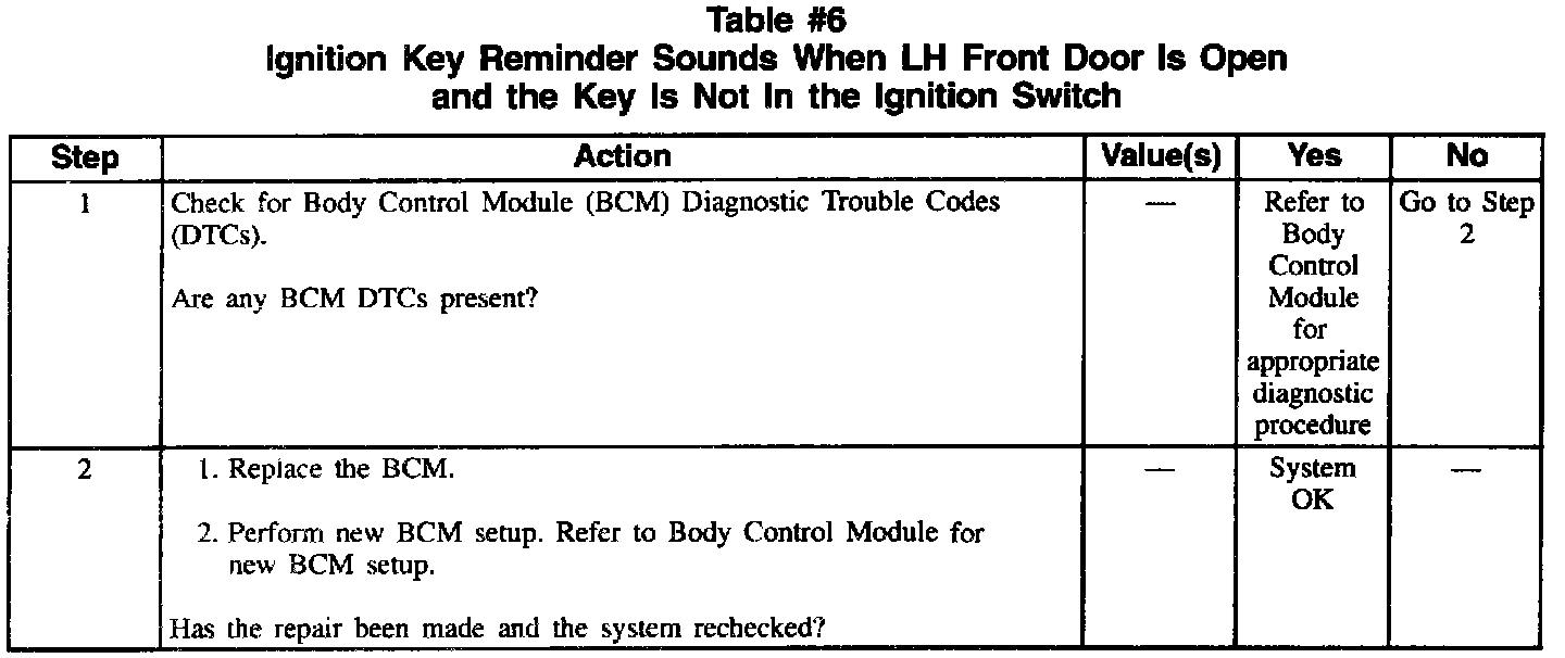 Table #6 Ignition Key Reminder Sounds When LH Front Door Is Open And The Key Is Not In The Ignition Switch: