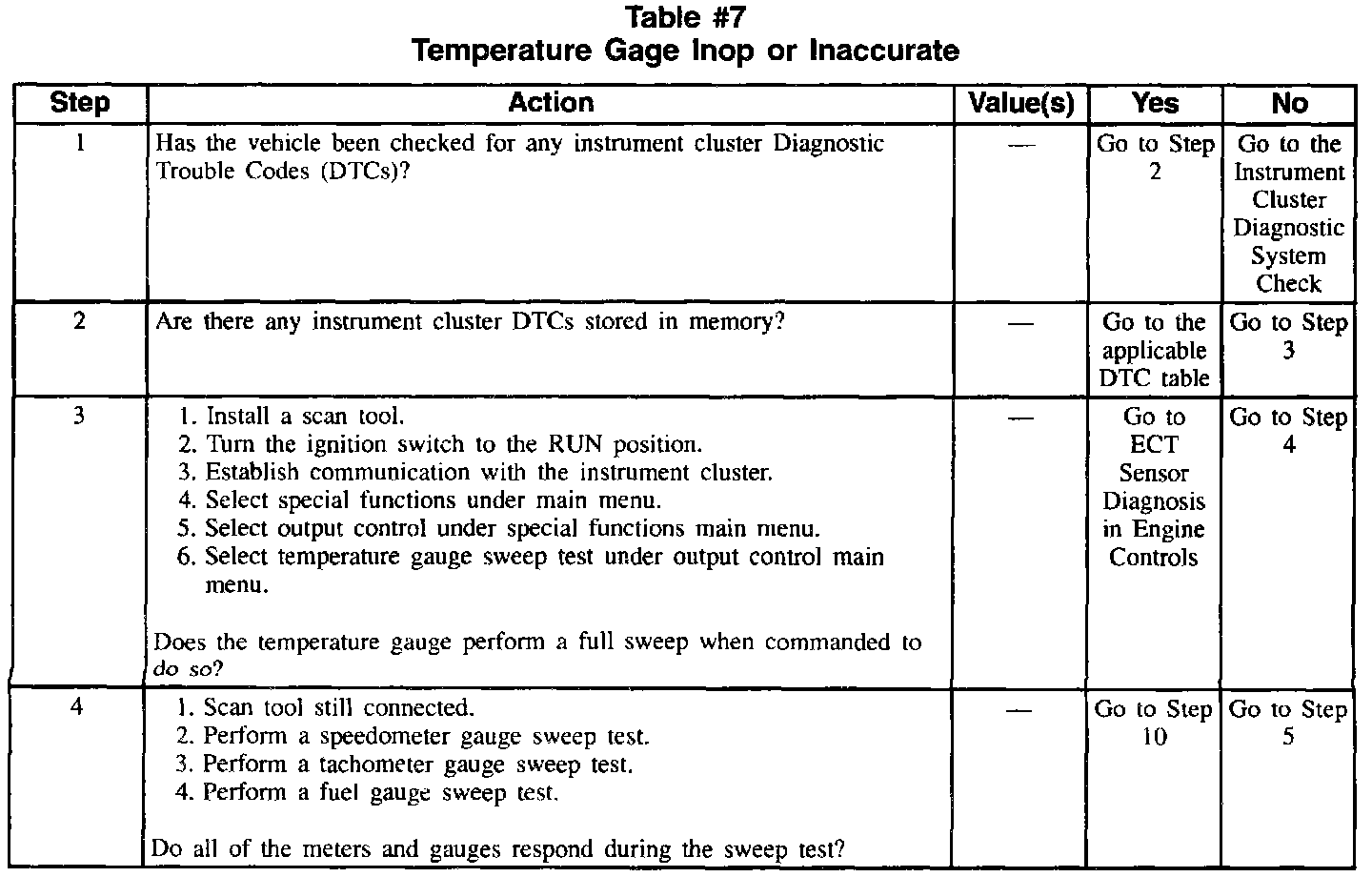 Table 7 Temperature Gage Is Inoperative/Inaccurate