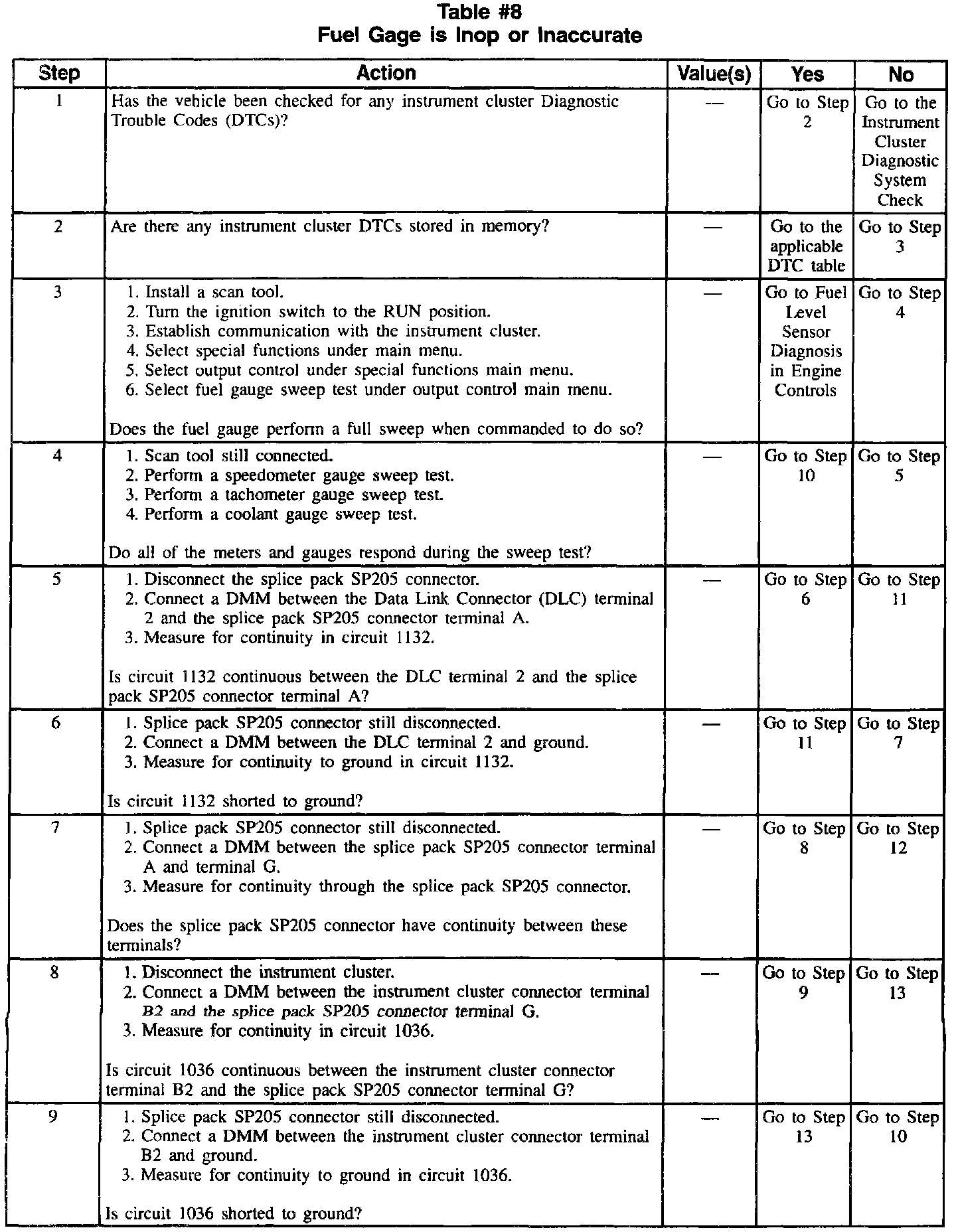 Table 8 Fuel Gage Is Inoperative/Inaccurate