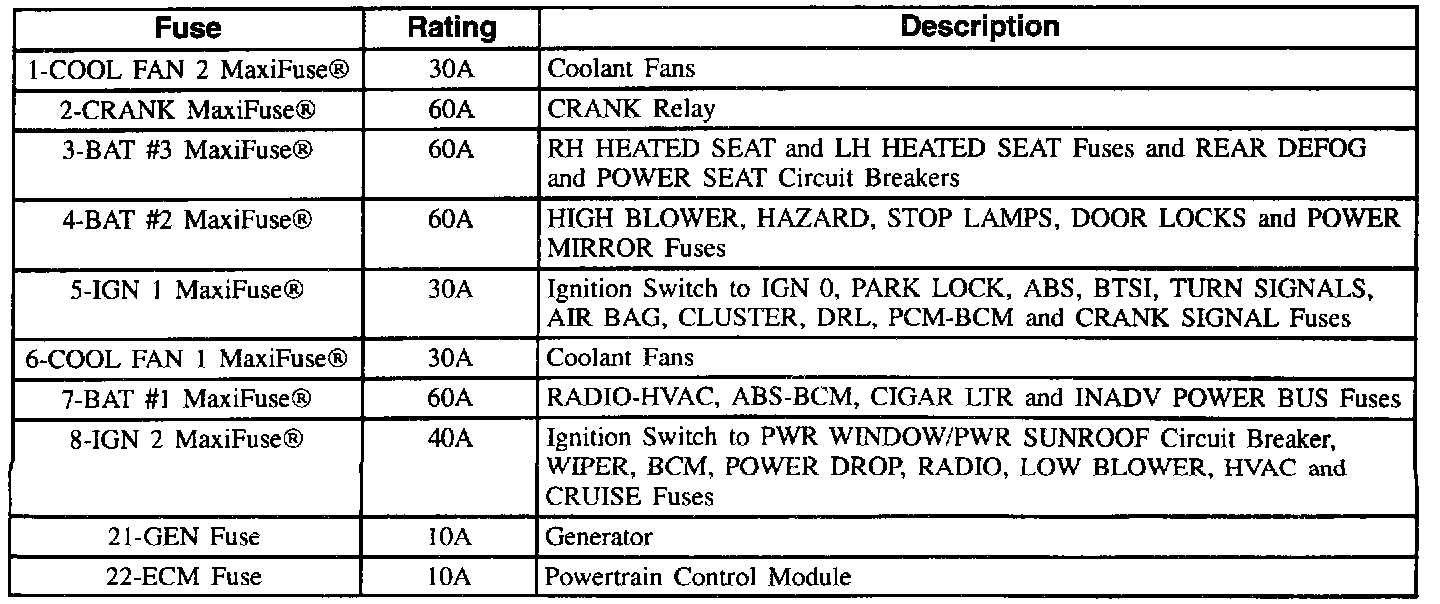Underhood Electrical Center Fuse Application Table (Part 2 Of 2):