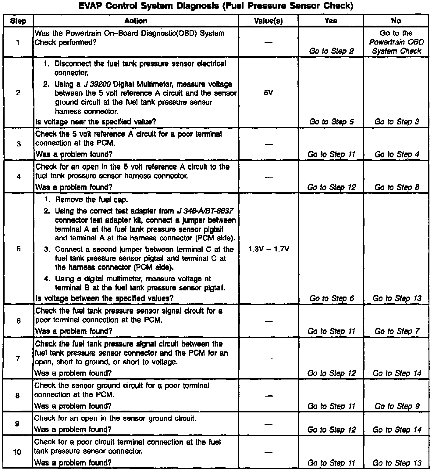 The Fuel Tank Pressure Sensor Diagnosis table is intended to isolate and diagnose electrical problems with the sensor wiring or the sensor.