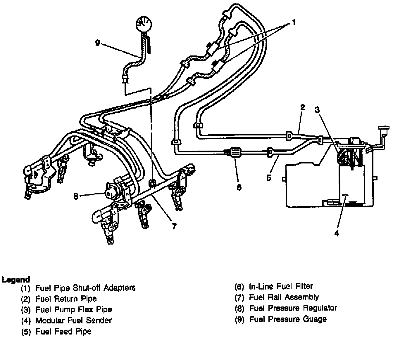 When the ignition switch is turned ON, the Powertrain Control Module (PCM) will turn ON the in-tank fuel pump. The in-tank fuel pump will remain ON as long as the engine is cranking or running and the PCM is receiving reference pulses. If there are no reference pulses, the PCM will turn the in-tank fuel pump OFF 2 seconds after the ignition switch is turned ON or 2 seconds after the engine stops running. The in-tank fuel pump is an electric pump within an integral reservoir. The in-tank fuel pump supplies fuel through the fuel feed pipe, and in-line fuel filter to the Fuel Rail Assembly. The fuel pump is designed to provide fuel at a pressure above the pressure needed by the fuel injectors. A fuel pressure regulator, attached to the Fuel Rail, keeps the fuel available to the fuel injectors at a regulated pressure. Unused fuel is returned to the fuel tank by a separate fuel return pipe. The fuel pressure gauge J 34730-1A and fuel pipe shut off adapters J 37287 are used for fuel system diagnosis.