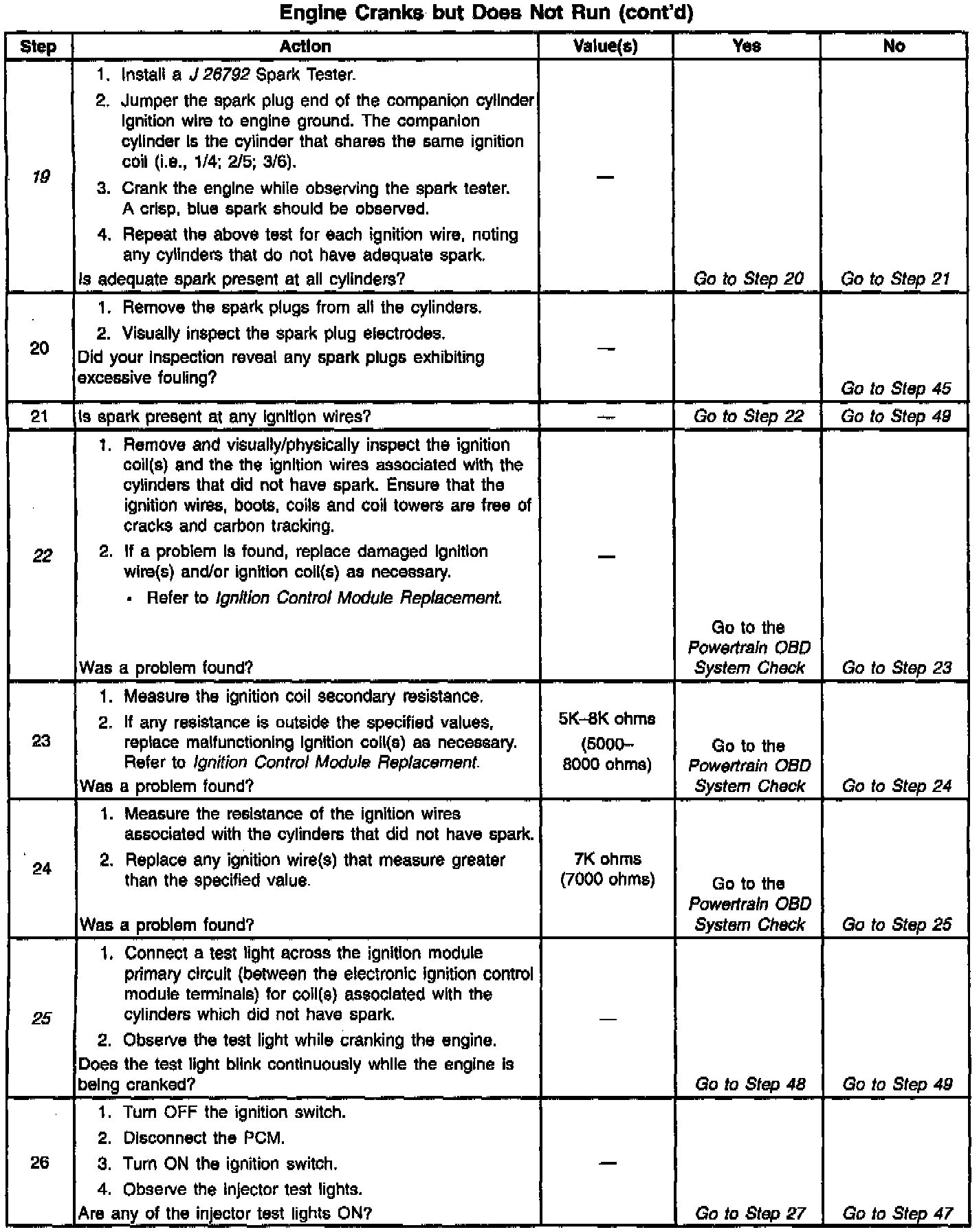 19. By using a J 26792 Spark Tester, checks for adequate secondary coil output.