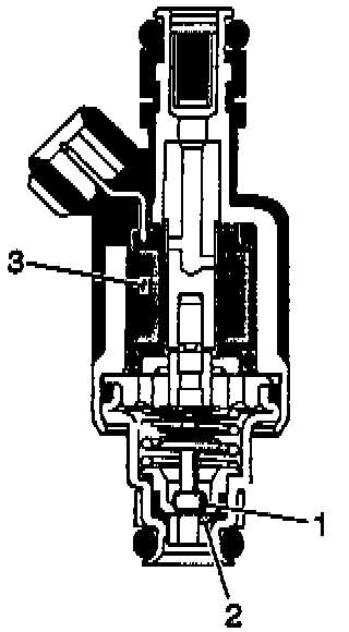 The Sequential Multipoint Fuel Injection (SFI) fuel injector is a solenoid (3) operated device controlled by the PCM. The PCM energizes the solenoid which opens a valve (1) to allow fuel delivery onto the director plate (2).