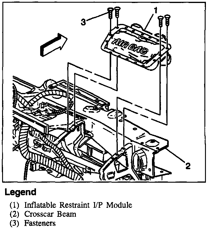 There is a shorting bar on the inflatable restraint I/P module connector that connects to the SIR wiring harness. The shorting bar shorts across the inflatable restraint I/P module circuits during the disconnection of the inflatable restraint I/P module connector. The shorting of the inflatable restraint I/P module circuitry will help prevent unwanted deployment of the air bag when servicing the inflatable restraint I/P module, the instrument panel or other SIR system components.