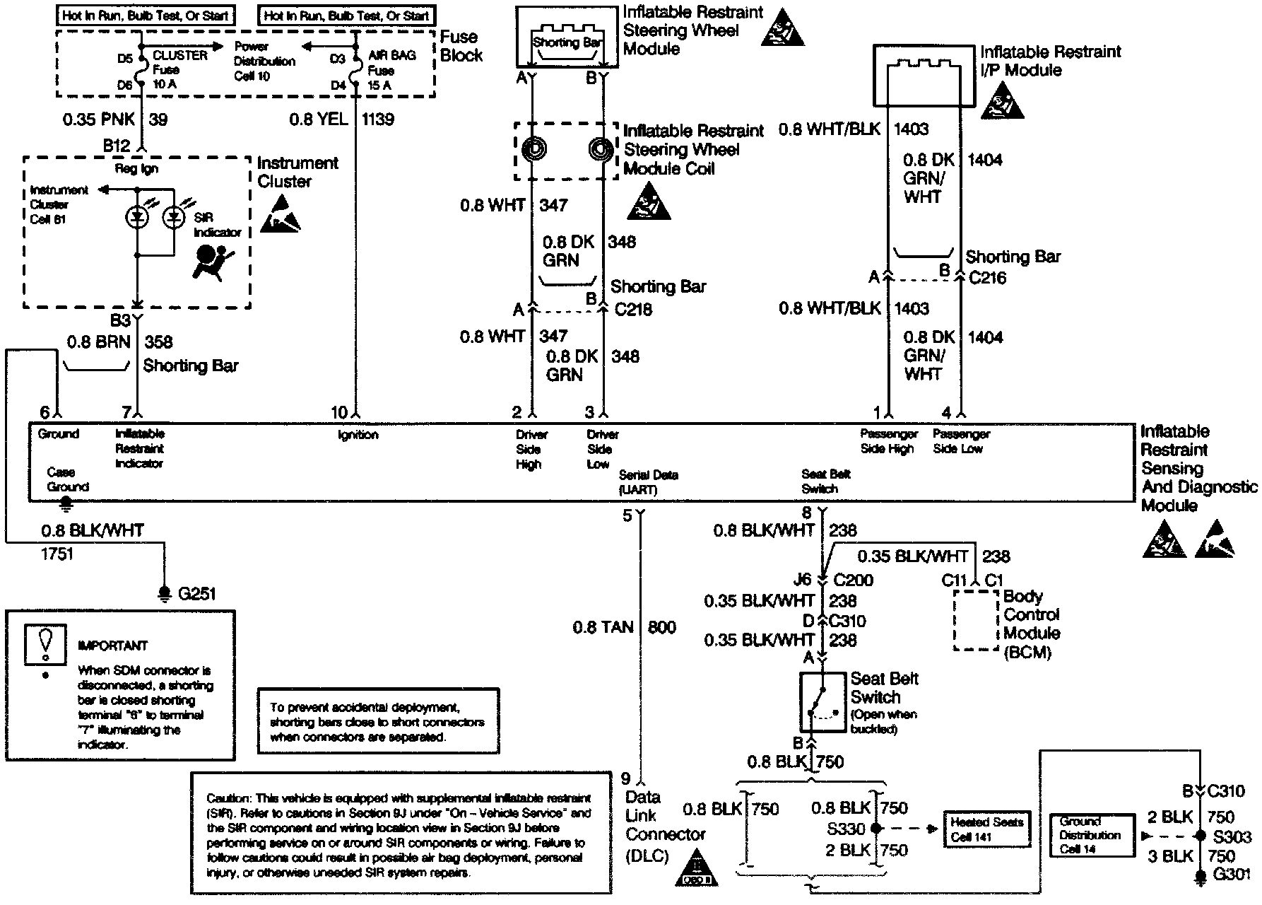 The inflatable restraint Sensing and Diagnostic Module (SDM), inflatable restraint steering wheel module coil (SIR coil assembly), inflatable restraint steering wheel module (driver inflator module), inflatable restraint I/P module (passenger inflator module) and connector wires make up the deployment loops. The function of the deployment loops is to supply current through the inflator modules, which will cause deployment of the air bags. Deployment occurs when the SDM detects vehicle velocity changes severe enough to warrant deployment.