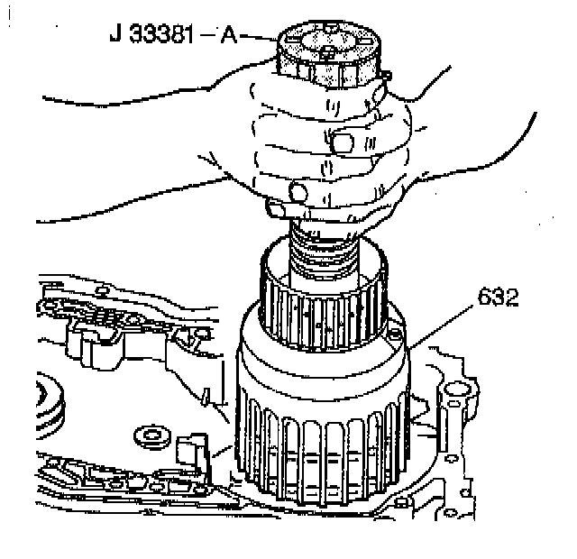 2. Install J 33381-A into the input clutch housing assembly (632).