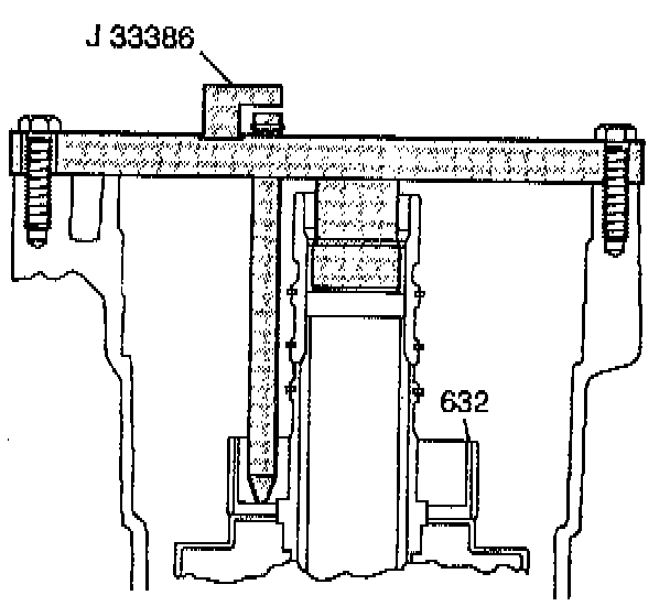 12. Use a feeler gage in order to measure the clearance between J 33386 and the thrust washer (630):
