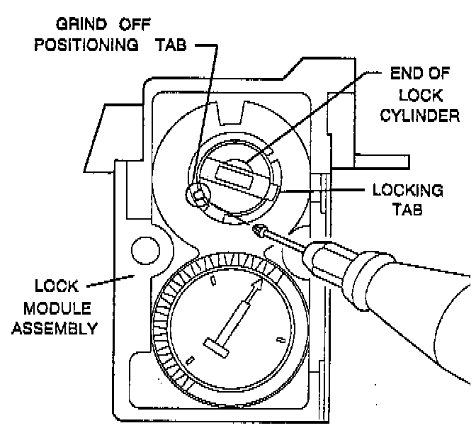 17. Remove positioning tab on end of lock cylinder (17) using an 1/8-inch burring tool.