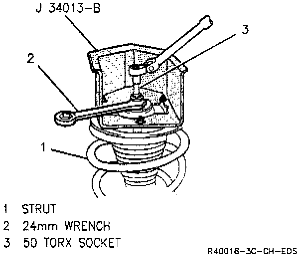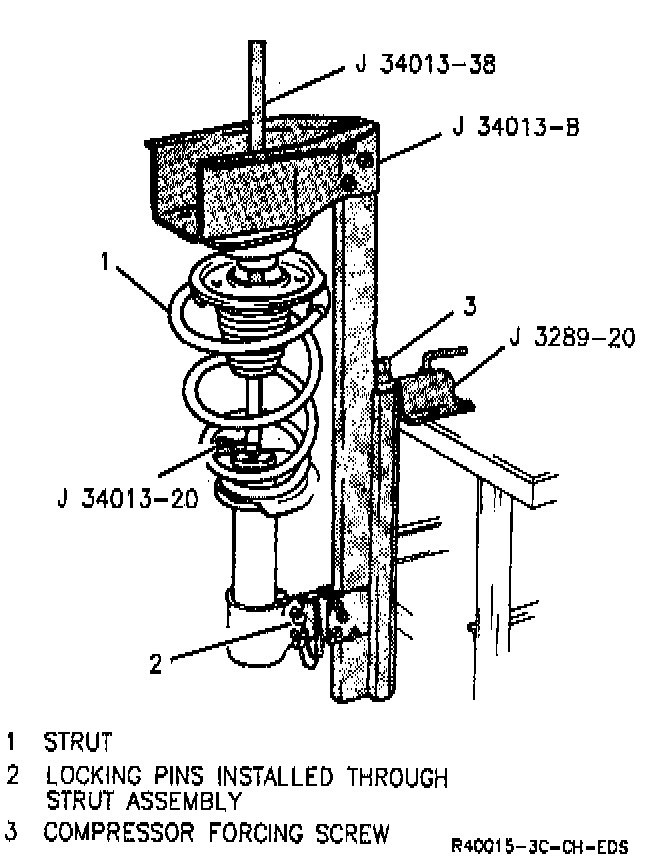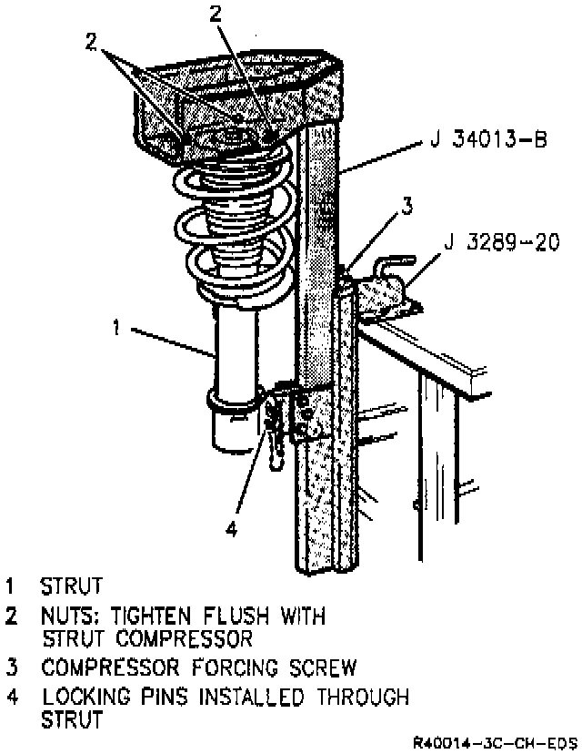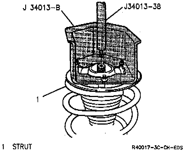 1. Install strut in strut compressor J 34013-B and J 3289-20.
