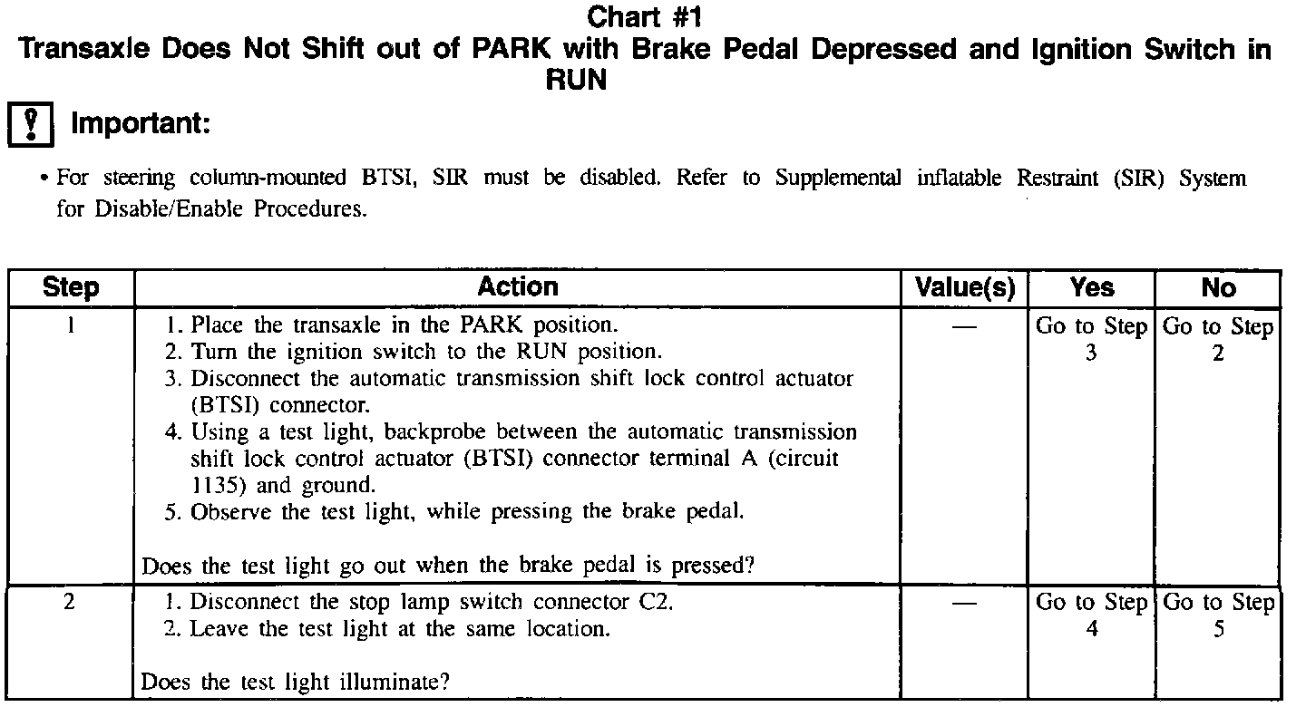 Chart #1 Transaxle Does Not Shift Out Of PARK With Brake Pedal Depressed And Ignition Switch In RUN (Part 1 Of 2):
