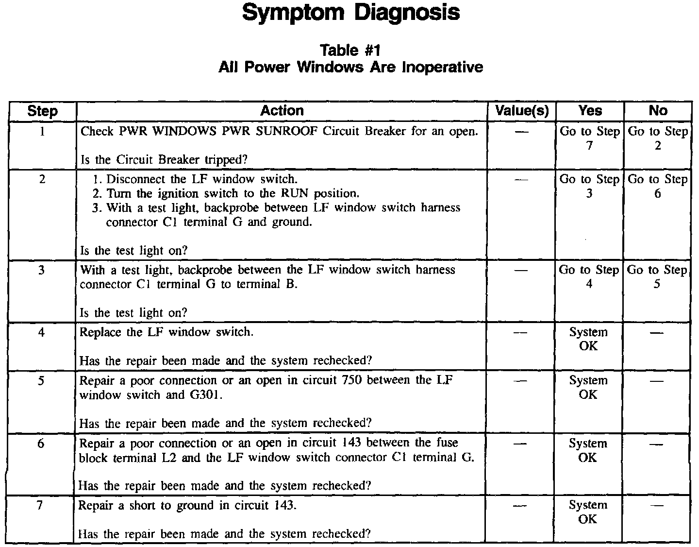 Table 1: All Power Windows Are Inoperative