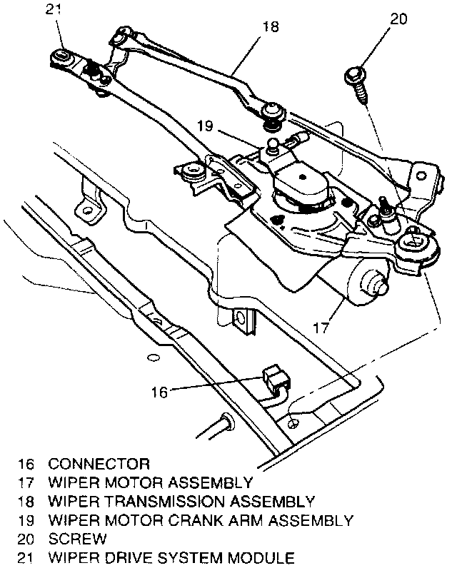 5. Three screws (20) and wiper drive system module (21) from vehicle.