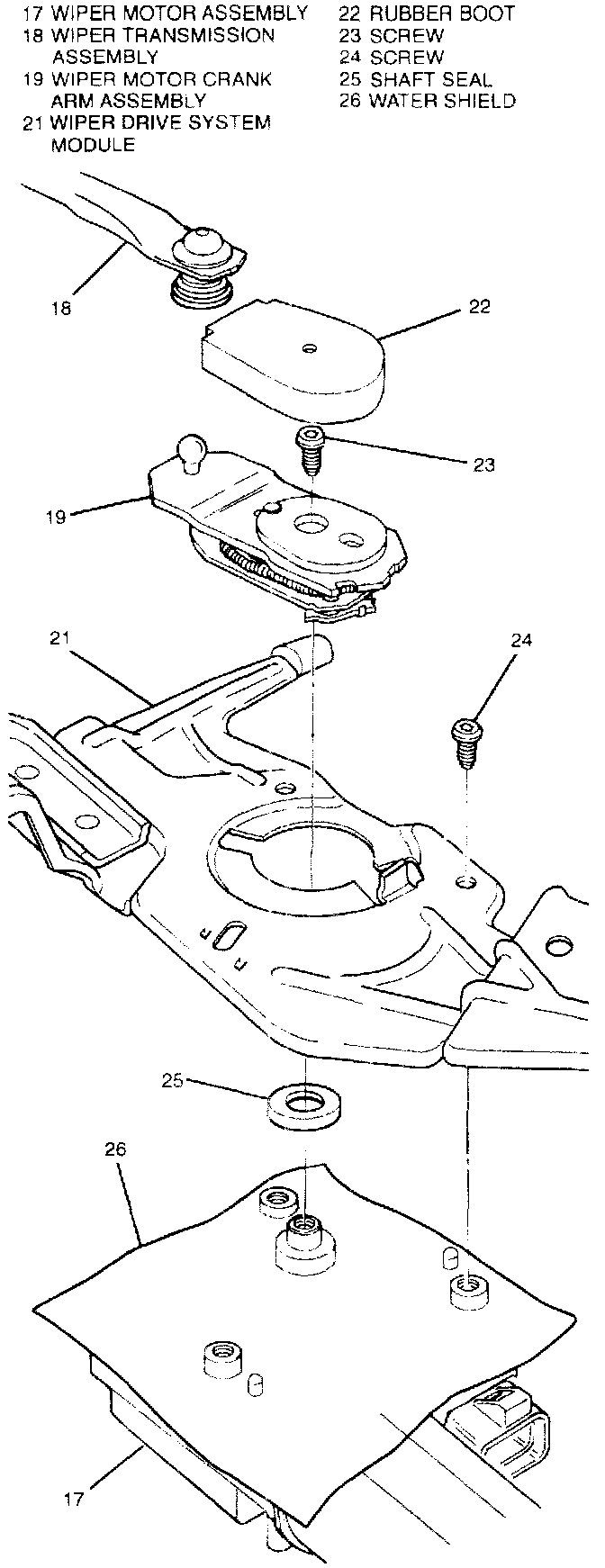 1. Water shield (26) and shaft seal (95) on wiper motor assembly (17).